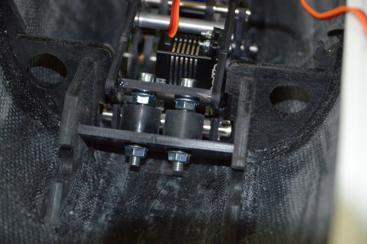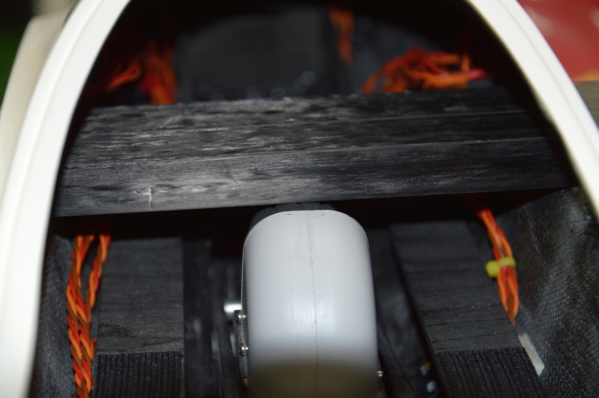 Das gilt auch für den gesamten Rumpf, stocksteif, aber keinesfalls zu schwer. Er ist innen komplett schwarz, Carbongewebe findet sich aber erst ab der Nasenleiste der Profilanformung nach hinten, davor ist Glasgewebe mit schwarz eingefärbtem Harz eingelegt worden. Das sieht gut aus und ist 2,4-Giga-freundlich. Überhaupt geht der Rumpfausbau flott voran, wenngleich das fertig eingebaute Einziehfahrwerk gleich mal wieder heraus muss – anders ist das benötigte Servo nämlich nicht an seinen Arbeitsplatz zu verfrachten.