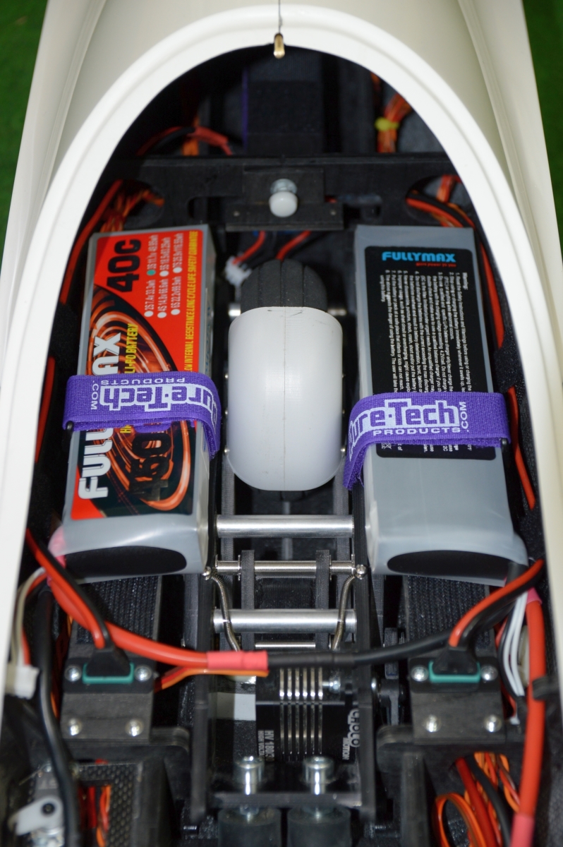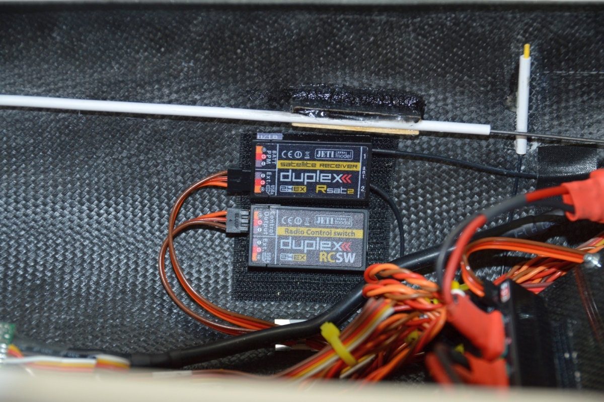 Als redundantes System dient eine Jeti Central Box 200, ihr zur Seite gestellt sind zwei Jeti Duplex Rsat2, mit Strom versorgt wird alles aus zwei Zweizellern mit jeweils 2.500 mAh Kapazität. Ein- und ausgeschaltet wird vom Sender aus über den Jeti RC-Switch, im Modell ist also kein mechanischer Schalter verbaut. Safety first!