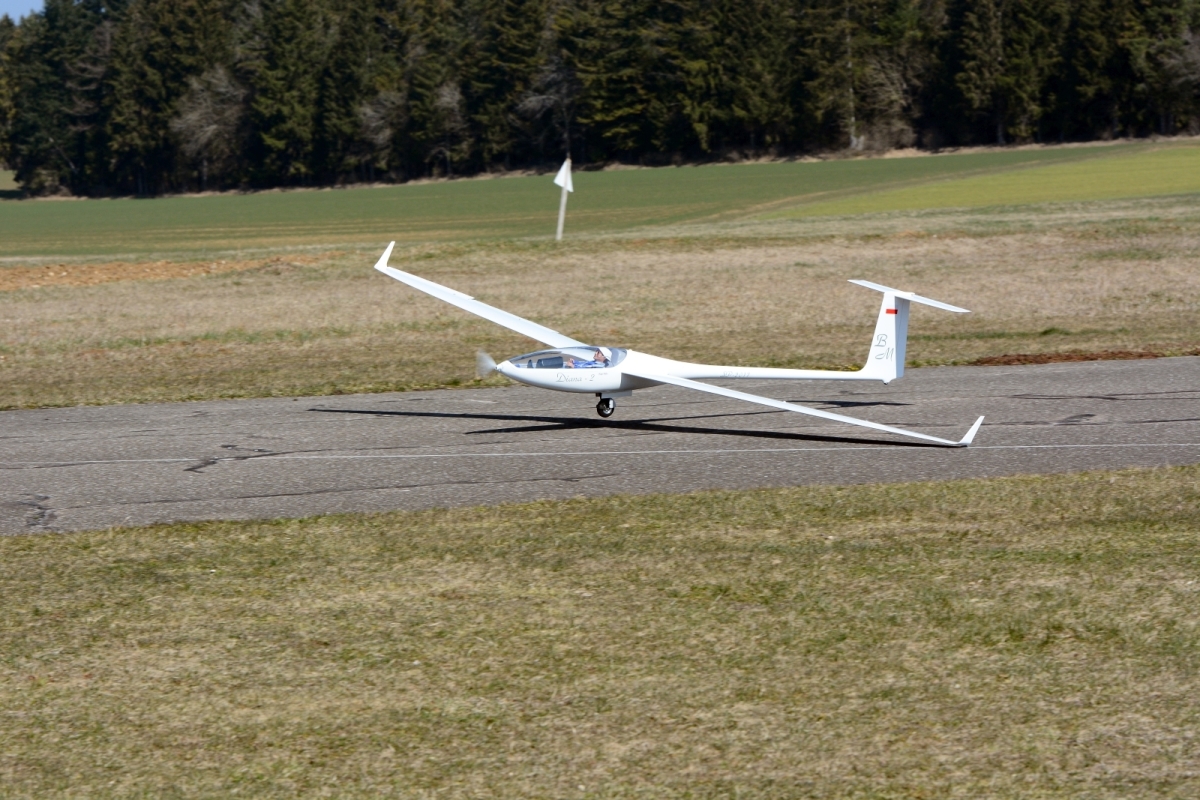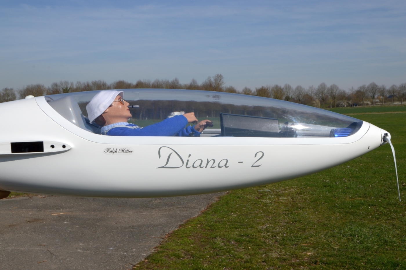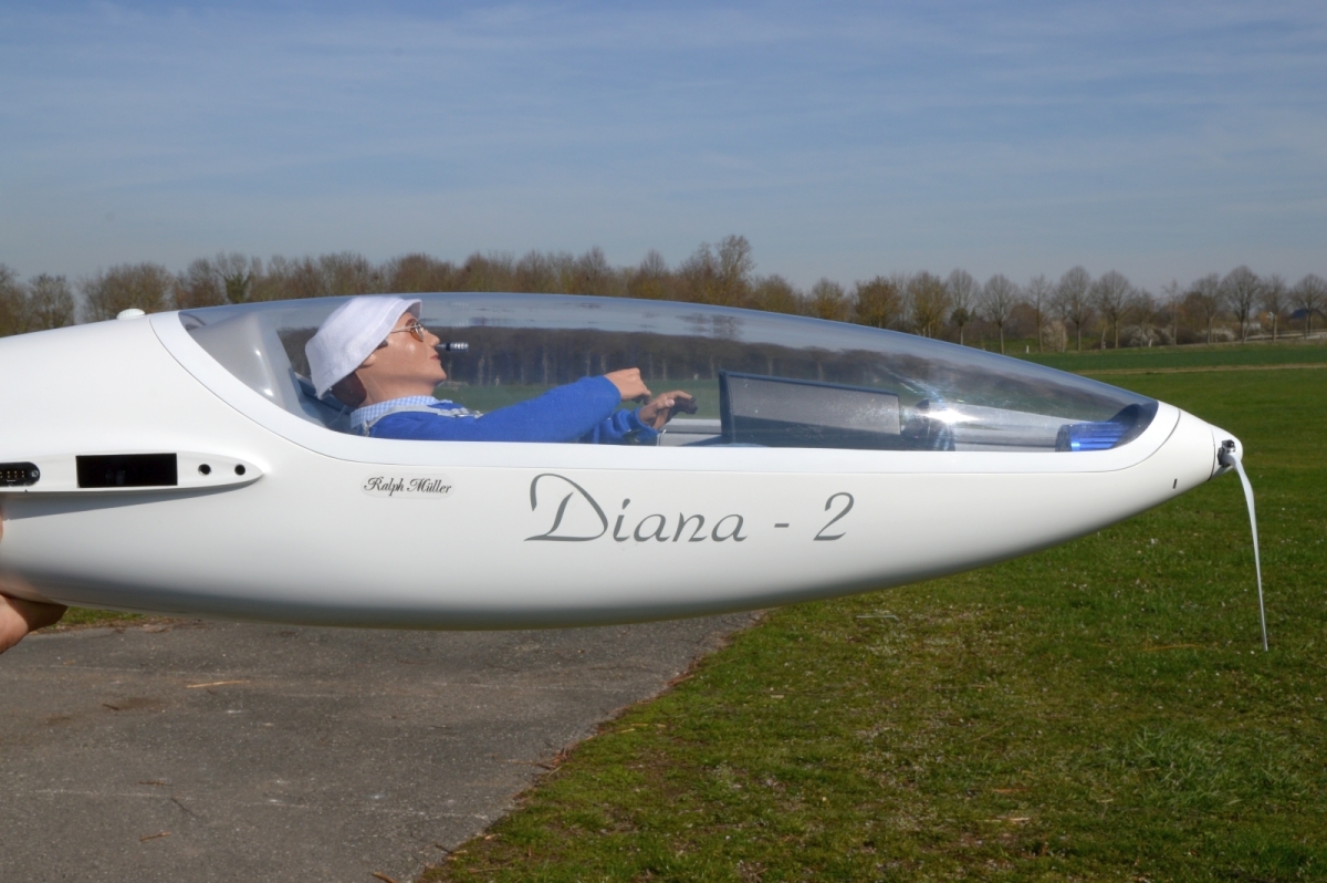 Bei der Diana ist alles anders. Sie wurde von vorneherein auf ein Einziehfahrwerk gestellt, das deutlich weiter vorne platziert ist und viel weiter als üblich herauskommt, ausfährt, was der Bodenfreiheit äußerst zuträglich ist. Auf Asphaltpisten gestattet das gar die Montage von Propellerblättern mit 17 Zoll Durchmesser. Wie porentief geil ist das denn? So steht sie also mit hoher Anstellung zur Piste und zum ersten Selbststart bereit. Da die Antriebsleistung bei den vorherigen Flügen überzeugen konnte, bestehen bezüglich Rollphase keinerlei Bedenken, unsere 60 Meter lange Asphaltpiste reicht allemal. Anrollen, ein Helfer, der auf den ersten Metern eine der Flächen mit der Hand führt, ist von Vorteil. Der kann seine Tätigkeit ob der Beschleunigung so früh einstellen, dass er völlig verdutzt dreinschaut. Der Pilot aber auch, nix Wackeldackel, kein Hin- und Hergeeiere um die Längsachse. Klar, dass in dieser Phase alle Flächenklappen mit den Querrudern mitlaufen, nur so ist ausreichende Wirkung bei noch niedriger Geschwindigkeit gewährleistet. Doch die nimmt schnell zu, und das Pistenende ist noch lange nicht erreicht, als das Rad den Asphalt verlässt. Durch die gegebene Anstellung ist auch nur leicht zu ziehen, Höhenruder langsam nachlassen und meine rassige Polin geht in die Luft. Na also, wer sagt denn, dass der Nasenantrieb out sei? Was die möglichen Steigwinkel angeht, übe ich mich in Demut – weil ich sie nicht messen kann – und behaupte aus Erfahrung: Lieber etwas flacher und dafür mit mehr Geschwindigkeit steigen ist effektiver als sie an die Latte zu hängen.