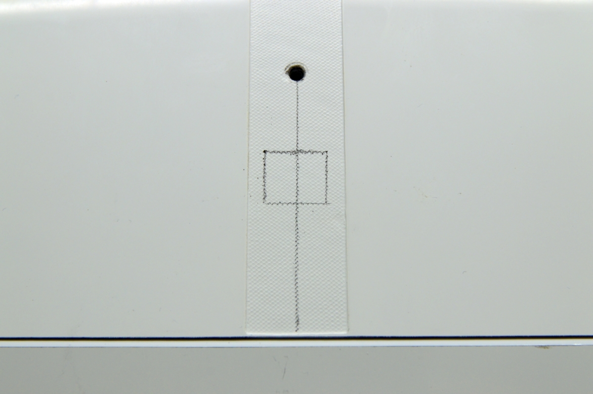 Die geschnittene Gewindebohrung ist zusätzlich angesenkt, nur wenig, es ist nicht viel Fleisch vorhanden, der Bolzen nicht ganz bis zum angezeichneten Maß eingedreht worden, etwas Sekundenkleber-Gel angegeben, eine Umdrehung weiter hineingedreht und erst mal in Ruhe lassen. Gel braucht seine Zeit, bis es hart ist. Knapp über dem Bolzen jetzt ein 2-mm-Loch bohren, mit der mit einer Kanüle bewehrten Spritze Harz einfüllen, Gewebeband über das Loch kleben, Fläche wieder senkrecht an die Wand stellen und härten lassen. Und auch diesmal ist ein bisschen Harz rausgelaufen. Das ist dem Gewebeband in die Schuhe zu schieben, weil es saugt. Also besser herkömmlichen Tesafilm benutzen.