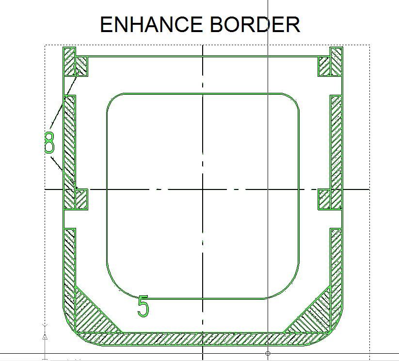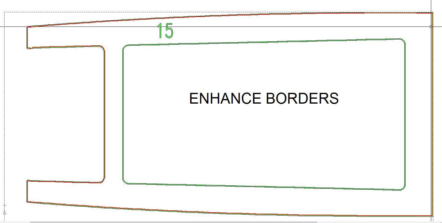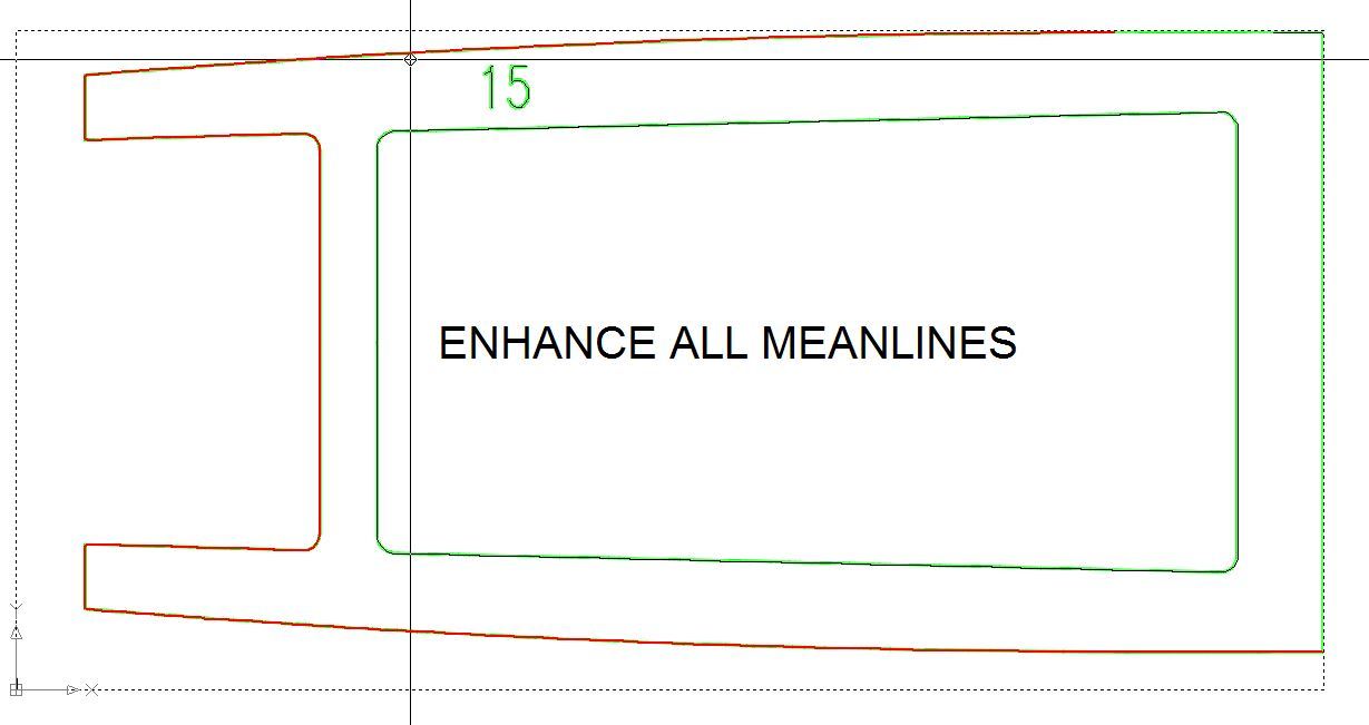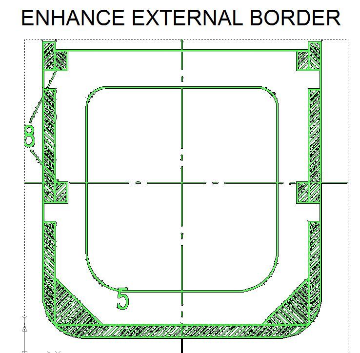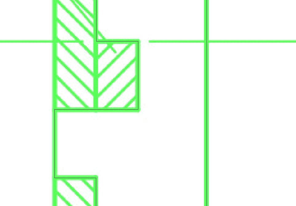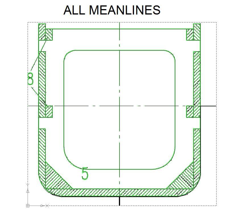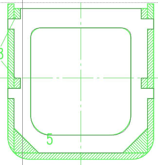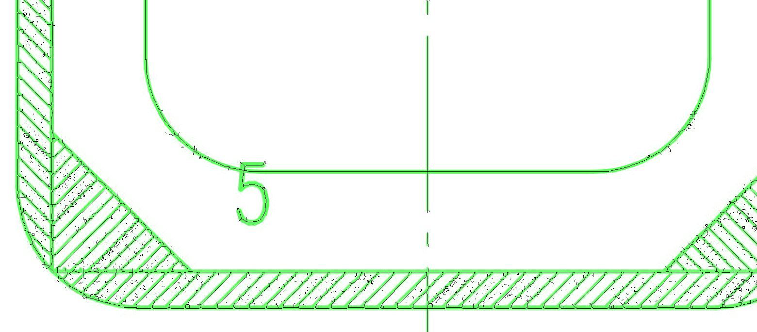 Mit Abstand am schlechtesten schneidet in diesen Fällen die Methode ab, die Hauptlinien als Mittellinien zu zeichnen. Bei dieser Methode wird versucht, aus einem mehrere Pixel breiten Strich der Bildvorlage in der Zeichnung, möglichst einen Vektor zu erzeugen. Dabei werden zum Teil „unendlich viele“ Vektoren erzeugt, die sich aus allem Möglichen zusammensetzen, nur nicht aus geraden Strichen. Die Bilder 1 und 2 zeigen für Spant 5 was gemeint ist. Damit man Hintergrundbild und erzeugte Linien unterscheiden kann, sind das Bild hell grün und die automatisch erzeugten Linien in schwarz dargestellt. Für den gezeigten Spant werden mehr als 2.000 einzelne Linien gezeichnet. Die einzig brauchbaren sind die orthogonalen Linien des Ausschnittes und der oberen Begrenzung.