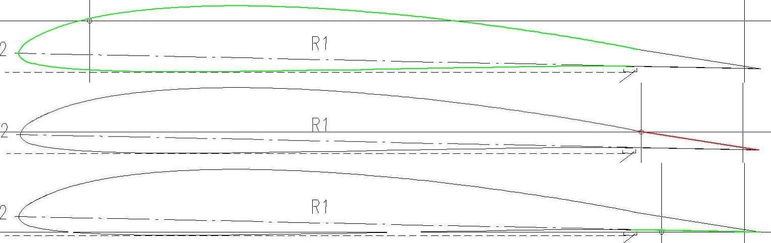 Für das Nachkonstruieren des Flügels in DevWing benötigt man natürlich eine Profildatei. Der Baubeschreibung kann man entnehmen, dass ein modifiziertes Profil SD7037 verwendet wird, wobei zur Modifikation keine Aussagen getroffen werden. Da der Plan eine fast isolierte Profilzeichnung enthält, produziert PDF2DXF auch eine nahezu perfekte Profilzeichnung. Bild 11 zeigt, dass lediglich drei Linien entstehen, die sehr schnell zu einer verbunden werden können. Ist das getan, hat man auch fast schon eine Profildatei. DevCad bietet nämlich die Möglichkeit, aus einer geschlossenen Linie eine DAT-Datei erzeugen zu lassen, wobei die Maße dabei auch gleich auf 1 normiert werden. In der Regel reicht ein Mausklick und man hat damit eine Profildatei. In Einzelfällen, kann es jedoch erforderlich werden, dass man die Reihenfolge der Koordinatenpaare an die Konventionen der Profildateien anpassen muss (x von 1 bis 0 zu 1). Dies kann man mit einem einfachen Editor tun. Im Falle des Thermy Profils war keine Nachbearbeitung erforderlich.