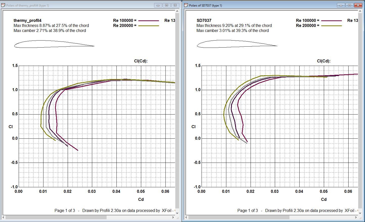 Das modifizierte Profil zeigt im unteren Re-Bereich praktisch keine Laminardelle mehr, was sich an den schmaleren Flügelenden dahingehend besser auswirken könnte, dass der Flügelwiderstand bei kleineren Anstellwinkeln insgesamt kleiner wird als beim Originalprofil. Auch bleibt die Widerstandsänderung von etwa 0,2 bis 0,8 etwas geringer als beim Originalprofil. Beides deutet darauf hin, dass das Modell mit dem modifizierten Profil im normalen Geschwindigkeitsbereich etwas schneller sein und es etwas mehr Durchsetzungsvermögen haben dürfte. Das originale Profil weist ein etwas höheres ca max auf. Außerdem nimmt bei größeren Anstellwinkeln im Gegensatz zum modifizierten Profil nicht nur der Widerstand sondern auch der ca-Wert immer noch deutlich zu. Von daher würde ich mal davon ausgehen, dass das Originalprofil beim „Wiesenschleichen” eindeutig Vorteile haben dürfte.