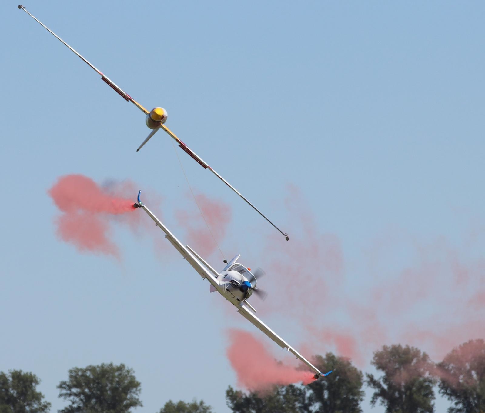Wenn Dominik Grebe und Markus Rummer F-Schlepp fliegen, dann sieht das etwas anders aus als bei unsereiner. Ihre Show mit dem Bruckmann Swift und der Grob G120TP von den Modellflughelden muss man gesehen haben. Und sollte es nicht nachmachen.