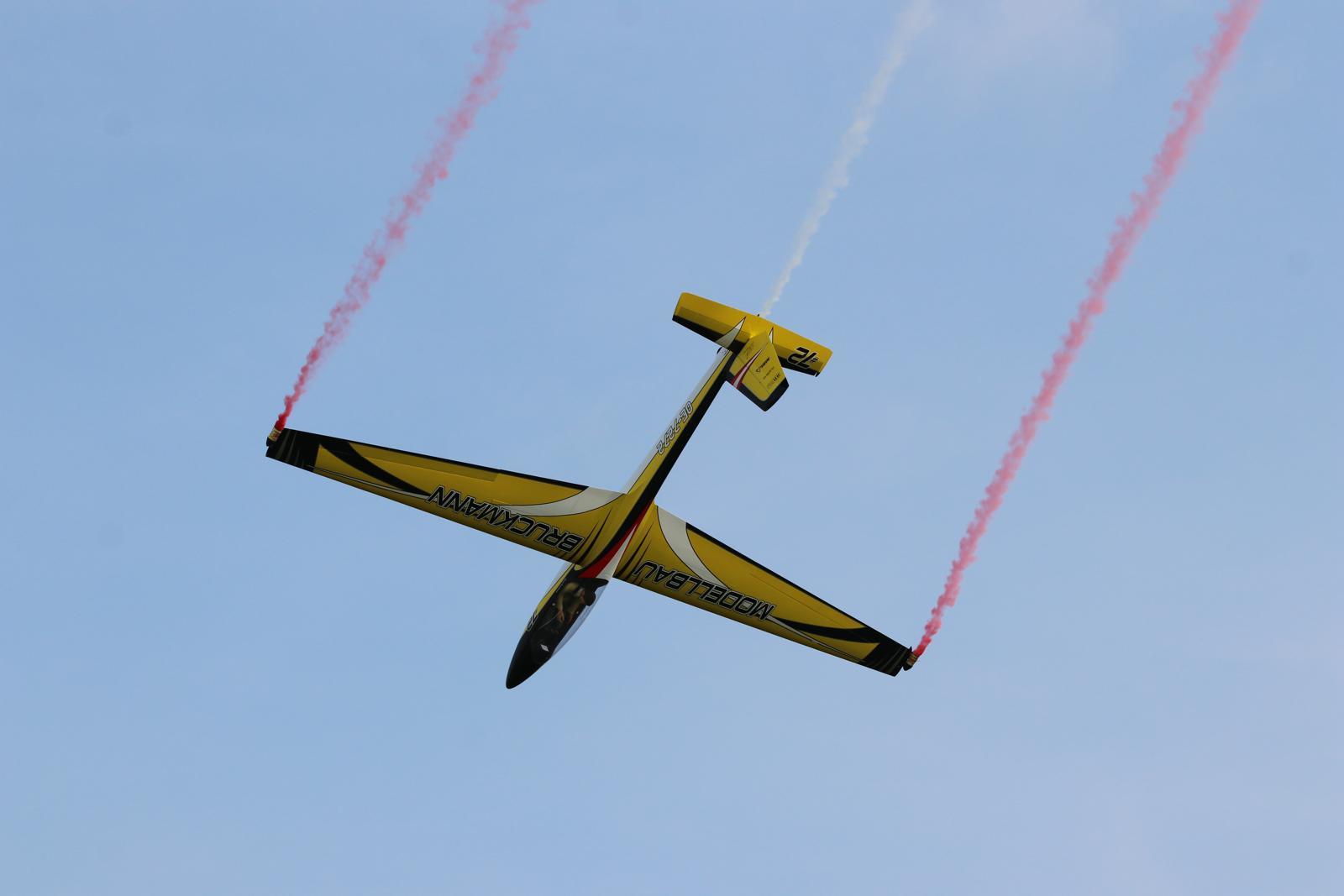 Die absolute Show erleben wir beim Display von Alexander Raff – kein Wunder, ist er doch der F3A-X Sieger 2019. Obwohl ohne Motor, geht auch Gernot Bruckmann heftig und tief zur Sache mit seinem 5,8 m großen Swift S1. Eines der aktuellen Eigenbau-Highlights ist die mächtige Pilatus SB-2 Pelikan von Markus Frey, ein fantastisches Scale-Display steht uns bevor.