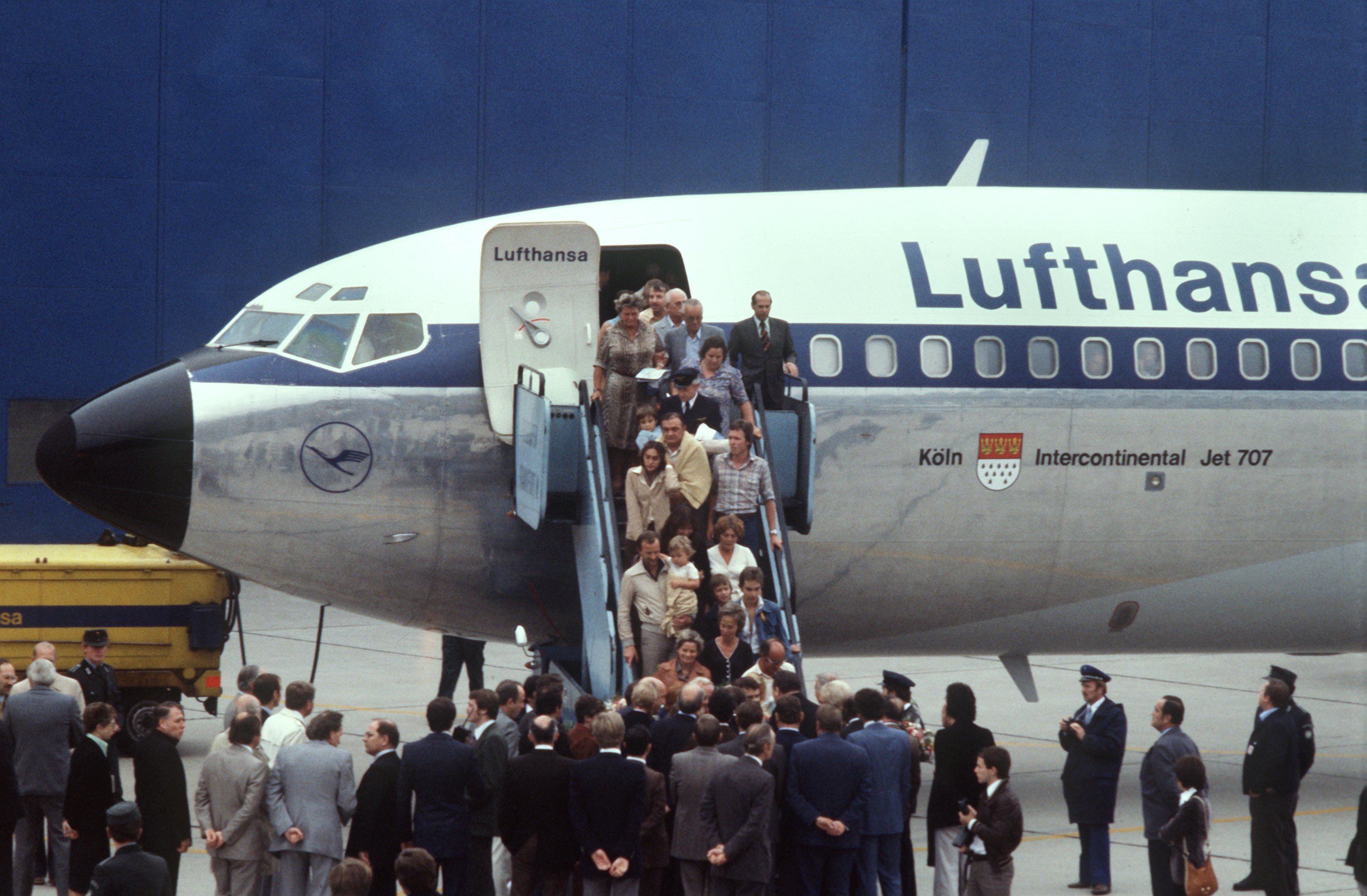 18.10.1977: Ankunft der entführten Geiseln am Flughafen in Frankfurt am Main. Foto: © dpa Bildarchiv