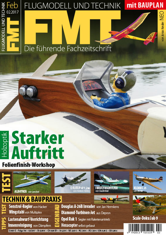 Traumhaft schöner Holzlook: In unserem Bau-Workshop der neuen FMT 02/2017 zeigt Jürgen Bestenlehner Schritt für Schritt, was mit einem Folienfinish alles möglich ist. Weitere Baupraxis-Themen dieser Ausgabe: Wir beschreiben eine Mechanik für den Reihenabwurf von Fallschirmen, die Impellerumrüstung einer Opel RAK.1 und den Eigenbau eines Hexacopters. Ganz viel Baufreude bereitet auch unsere Bauplanbeilage, der Elektrosegler NEO von Jonas Kessler. Getestet haben wir in der neuen FMT: P-47D Razorback 1.2M von E-flite, FMS Firefly Nightflyer von Staufenbiel, Albatros von aerobel, RESport von Grupp-Modellbau, RC-Nyos Hybrid von Hacker, Klemm L25 von Extron/Pichler, Master Senstrol von Hacker Motor, Wingstabi 16-Channel von Multiplex.