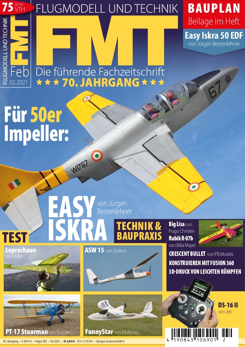 Vorbildähnlich, dynamisch und gutmütig: Die für 50-mm-Impeller ausgelegte Easy Iskra 50 EDF ist das attraktive Bauplanbeilage-Modell der FMT 02/2021. Weitere Top-Themen der neuen Ausgabe: Jeti DS-16 II von Hacker Motor, FunnyStar von Multiplex, Leprechaun von Zeller Modellbau, Crescent Bullet von PB Models, aero-naut-Ka-6E mit Torcman-FES, Rümpfe im 3D-Druckverfahren, Modell-Schutztaschen selbst gemacht.
