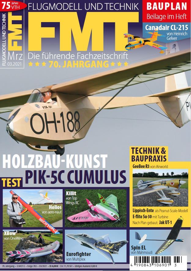 Lambert Pietschnig hat sich bei seinem neuen Eigenbau-Projekt ein exotisches Vorbild vorgenommen: den finnischen Schulungssegler PIK-5c Cumulus, die Titel-Story der neuen FMT 03/2021. Weitere Top-Themen der neuen Ausgabe: Spin und Spin EL von Mahmoudi, Helios von aero-naut, Killit von TOP WINGS, Jakowlew UT-1 als DXF-Datensatz, Gee Bee R3 von Airworld, Lichtsteuerung mit dem Flight-Controller, Eurofighter Indoor Edition von Multiplex. Als Bauplanbeilage gibt's die wunderschöne Canadair CL-215 von Heinrich Gelver.