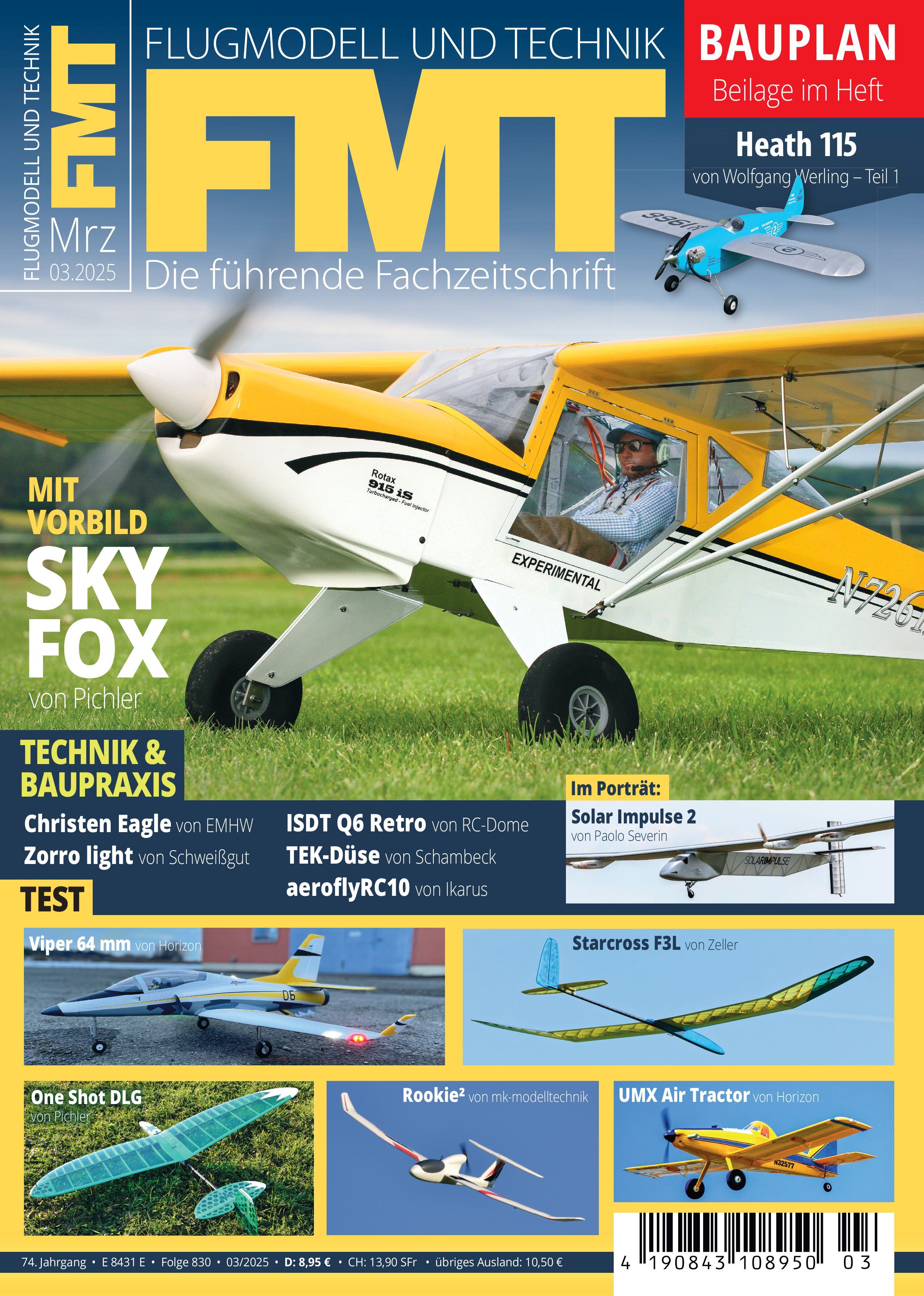 Die Sky Fox von Pichler liegt voll im Buschflugzeug-Trend. Wie robust, STOL-fähig und vorbildgetreu ist sie? Wir testen das ARF-Modell auf seine Stärken und Schwächen. Weitere Top-Themen der neuen Ausgabe: Solar Impulse 2 von Paolo Severin im Maßstab 1:7, Christen Eagle von EMHW, E-flite Viper 64mm von Horizon Hobby, Zorro Light 2 von Robert Schweißgut, Rookie² von mk-modelltechnik, aerofly RC10 von Ikarus, One Shot DLG von Pichler, ISDT Q6 Retro von rc-dome. Als Bauplanbeilage ist in diesem Monat der Retro-Racer Heath 115 Center Wing an Bord, neu konstruiert von Wolfgang Werling!