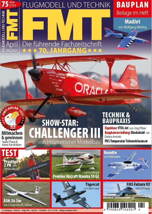 2,8 m Spannweite, DLE-222-Vierzylinder-Boxermotor und mit Smokeöl unter der 25-kg-Grenze. Das geht – zeigt Stefan Muth mit der Challenger III von Bill Hempel, Titelmodell der FMT 04/2021. Ein absolutes Highlight der neuen Ausgabe ist die FMT-Adlerwahl 2021 mit großem Gewinnspiel. Weitere Top-Themen: Prestige 2 PK von Samba Model, Tigercat von aero-naut, ASH-26 3 m von Composite RC Gliders, Premier Aircraft Mamba 10 G2 von robbe, FMS Futura V2 von D-Power, Revolto von RC Factory/Voltmaster, DJI Mavic Air 2 von Globe Flight. Als Bauplanbeilage gibt's den ersten Teil des MadJet, ein von Wolfgang Werling konstruierter, völlig unproblematischer Impeller-Racer.
