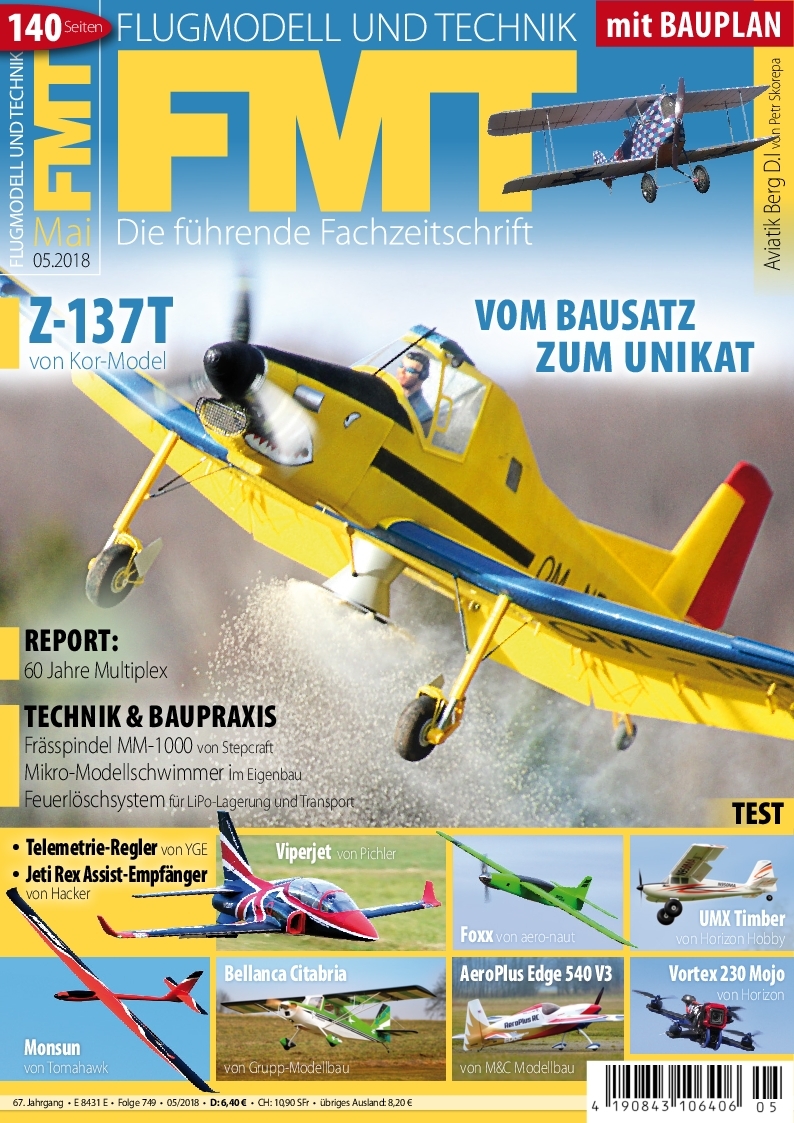 Das hübsche Titelmodell der FMT 05/2018 soll aus EPP sein? Oh ja, und zwar von Kor-Model aus Tschechien, weiter verfeinert von FMT-Autor Christian Huber. Alles dazu im großen Test- und Baupraxisartikel der neuen Ausgabe. Die weiteren Themen: Telemetrie-Regler von YGE, Jeti REX Assist von Hacker Motor, Frässpindel MM-1000 von Stepcraft, CAD-Bibiothek mit Schwimmern für Mikro-Modelle, aktives Löschsystem für LiPo-Lagerung und -Transport, Graupner Passat 57 als RC-Modell, Gurke Elektro von Tim Weißbach/Höllein, E-flite UMX Timber, Intention Elektro Plus von Simprop, Monsun von Tomahawk Aviation, Extreme Decathlon 1:3,3 von Grupp, Edge 540 V3 60 CCM von AeroPlusRC, Foxx von aero-naut, Blade Vortex 230 Mojo von Horizon, Viper Jet XL von Pichler. Und als Bauplanbeilage die Aviatik Berg D.I von Petr Skorepa.