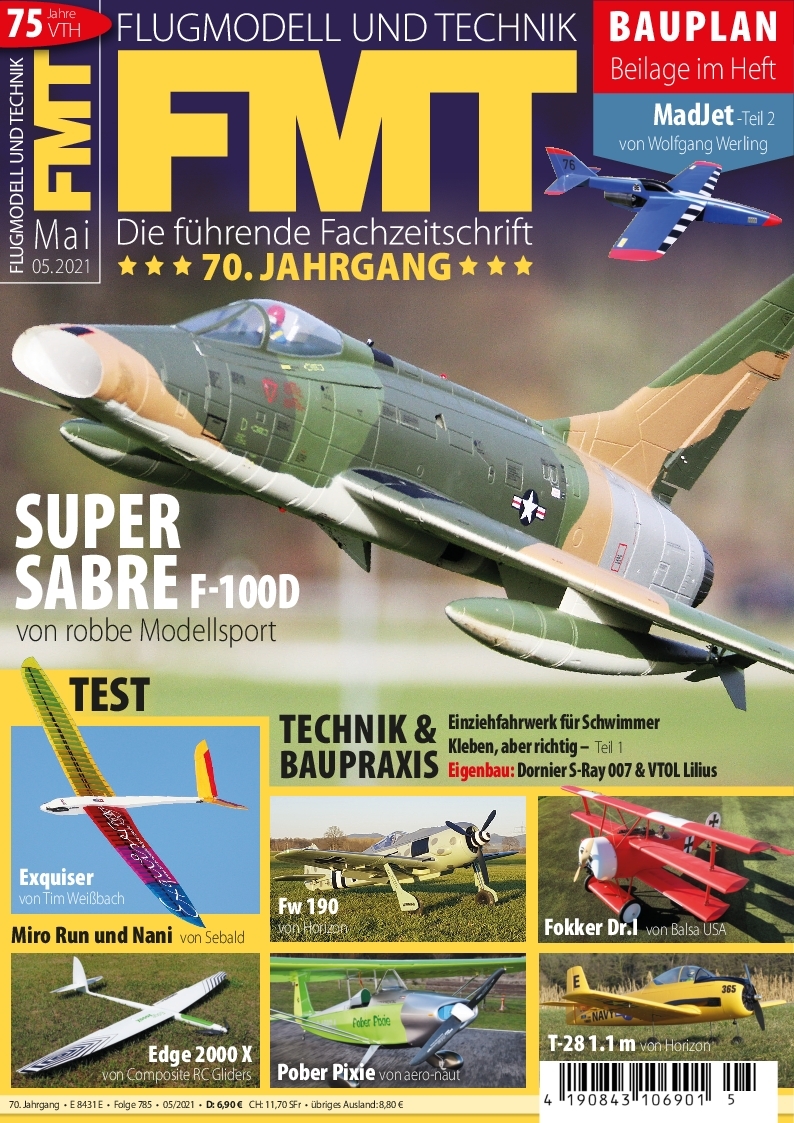 Wow! Die Ausstrahlung der Premier Aircraft F-100D Super Sabre von robbe ist atemberaubend. Aber wie schlägt sie sich im Test? Das finden wir in der FMT 05/2021 heraus. Weitere Top-Tests der neuen Ausgabe: Nani und Miro Run von Sebald Modellbau, Focke-Wulf Fw 190A 1.5m von E-flite, Pober-Pixie von aero-naut, Amethyst II von Pichler, Exquiser von Tim Weißbach, Edge 2000 X von Composite RC Gliders. Auch baupraktisch ist die FMT 05/2021 proppenvoll: Angefangen bei einer neuen Artikelserie über die Grundlagen des Klebens, den Eigenbau eines VTOL-Flugzeugs und Hugo Christens neuer Fokker Dr.I bis zum zweiten Teil des Bauplanbeilage-Modells MadJet.