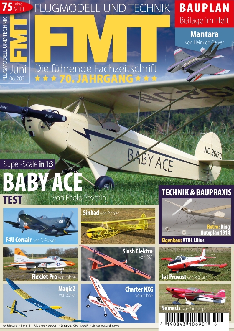Wenn sich Paolo Severin ein Projekt vornimmt, dann entsteht daraus nicht irgendein Modell. Sondern quasi ein verkleinertes Original. Das gilt auch für sein Baby Ace im Maßstab 1:3 - das Titelmodell der FMT 06/2021. Weitere Highlights der neuen Ausgabe: Nemesis NXT XL von Seagull/Simprop, Jet Provost T-4 von RBCkits, FlexJet Pro von robbe Modellsport, Charter NXG von robbe Modellsport, FMS F4U Corsair V3 von D-Power, Magic 2 Allround von Zeller Modellbau, Sinbad von Pichler. Als Bauplanbeilage ist das herrlich unkomplizierte Amphibien-Funmodell Mantara von Heinrich Gelver mit dabei.