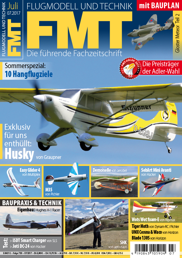 Vorhang auf für die Husky 1800S von Graupner! Wir haben uns die Neuheit in Kirchheim unter Teck angeschaut und stellen das Buschflugzeug in der FMT 07/2017 exklusiv vor. Sie suchen Hangfluggebiete für Ihren Urlaub? Zehn attraktive Standorte in Deutschland, Dänemark, Frankreich, Österreich und der Schweiz nehmen wir in der neuen Ausgabe unter die Lupe. Dann berichten wir von der 18. FMT-Adlerverleihung in Baden-Baden, testen den Wots Wot Foam-E von Ripmax, UMX Cessna 182 und Waco von E-flite, Tiger Moth von Dynam-RC, SHK von aero-naut, EasyGlider 4 von Multiplex, Jeti DC-24 von Hacker Motor, iSDT Smart Charger von SLS, Mini Avanti S von SebArt, Blade 130 S von Horizon Hobby, Demoiselle von aerobel und die Messerschmitt M35 von Extron. Auch baupraktisch ist diese FMT wieder sehr stark mit dem Porträt der Hughes-H-1-Racer von Harald Jezek und Jan Hirschmann, der Sprit-Kolumne von Franz Kayser, dem Artikel zu Spinner-Luftschraubenausschnitten mit der Portalfräse und natürlich dem zweiten Teil unserer Bauplanbeilage Gloster Meteor.