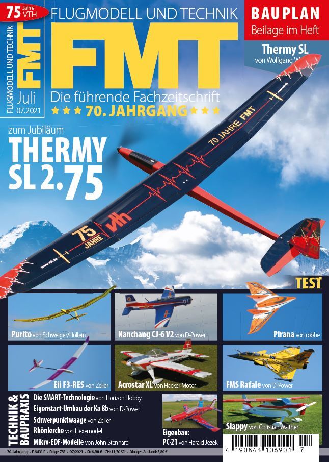70 Jahre FMT, 75 Jahre VTH – das feiern wir mit der zweiteiligen Bauplanbeilage Thermy SL von Wolfgang Werling, unserem Jubiläumsmodell. Den ersten Planteil dieses universellen Leistungsseglers - der in verschiedenen Varianten im VTH-Shop erhältlich ist - gibt's in der FMT 07/2021. Weitere Top-Themen der neuen Ausgabe: Eli F3-RES von Zeller Modellbau, Purito RES von Schweiger/Höllein, FMS Nanchang CJ-6 V2 von D-Power, FMS Rafale Jet EDF 80 von D-Power, Acrostar mk2 XL von Hacker Motor, SMART-Technologie von Spektrum, Pilatus PC-21 von Harald Jezek.