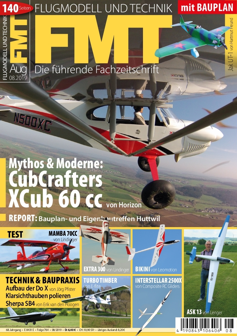 Das Vorbild der CubCrafters XCub 60cc von Hangar 9 ist eine hochmoderne Neuinterpretation des klassischen Buschflieger-Konzepts. Kann das Modell überzeugen? Das finden wir in der FMT 08/2019 heraus. Weitere Themen der neuen Ausgabe: Premier Aircraft Mamba 70CC von Lindinger, ASK 13 von Lenger Modellbau, Schwerpunktwaage und Deflection Meter von Zeller, Bikini von Topmodel France/Leomotion, Picus von Punkair/Cefics, Turbo Timber 1.5m von E-flite, Interstellar 2500 X von Composite RC Gliders, Eigenbau Short SB.4 Sherpa, Varianten der Tragflächensicherung, Tipps zum Entfernen von Klarsichthauben-Kratzern, Lackierung und Finish von Depron-Modellen, Beilagebauplan Jakowlew UT-1 (Teil 2), Reportagen vom Bauplan- und Eigenbautreffen Huttwil und dem Kärntner RC1-Retro-Wettbewerb. Und vieles mehr!