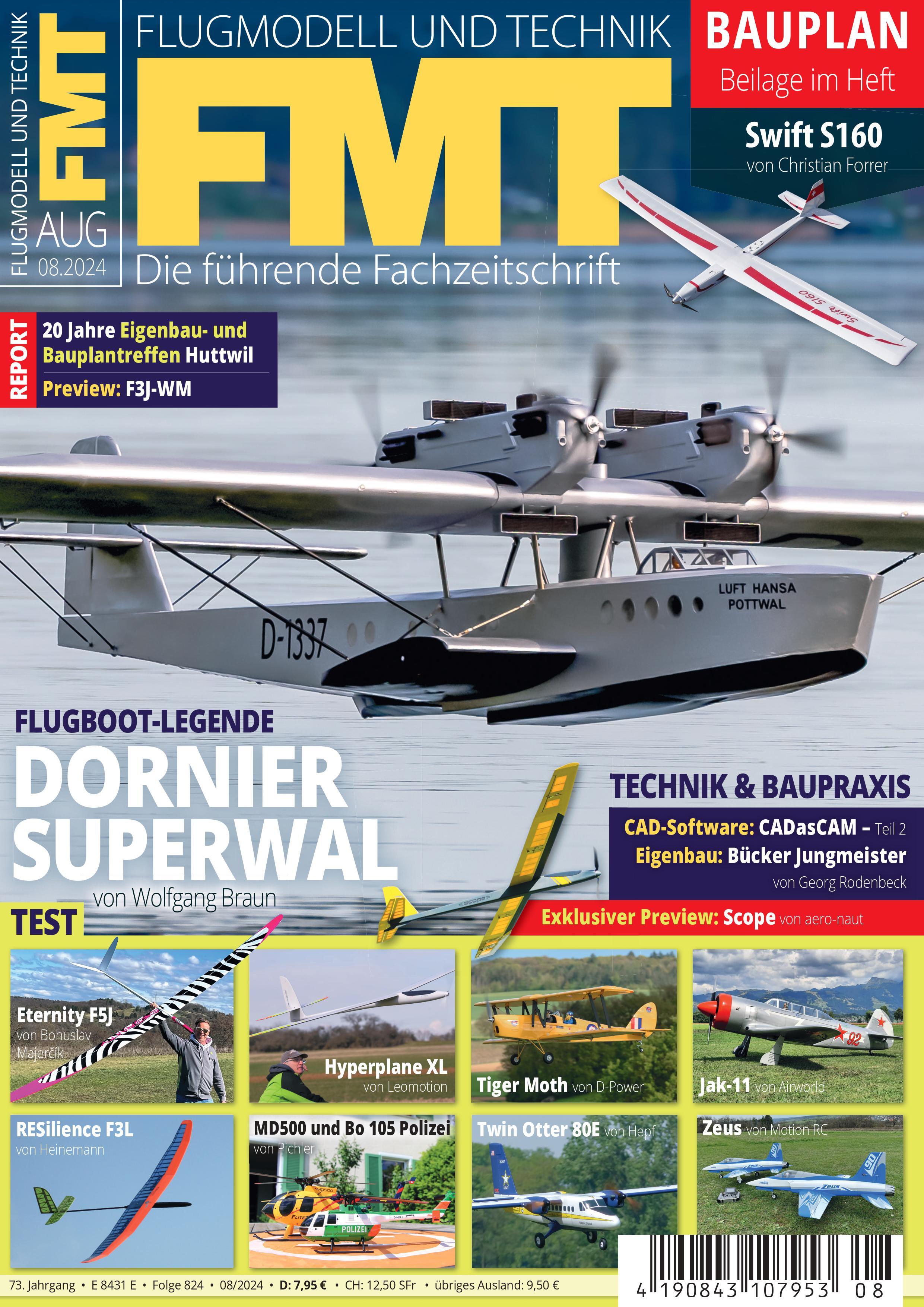 Mit der Dornier R4 NAS Superwal hat Wolfgang Braun ein anspruchsvolles Vorbild für seinen Eigenbau gewählt. Das Ergebnis im Maßstab 1:11 begeistert in jeder Hinsicht. Weitere Top-Themen der neuen Ausgabe: Preview Elektrosegler Scope von aero-naut, Vorbericht F3J-Weltmeisterschaft in Norwegen, Flex Innovations Twin Otter 80E von Hepf, Valenta Hyperplane XL von Leomotion, RESilience F3L von Heinemann Flugmodellbau, Phoenix Tiger Moth von D-Power, Jak-11 von Airworld, Eigenbau-Bücker-Jungmeister mit 3D-Druck-Teilen. Als Bauplanbeilage gibt's den Allroundsegler Swift S160 von Christian Forrer.