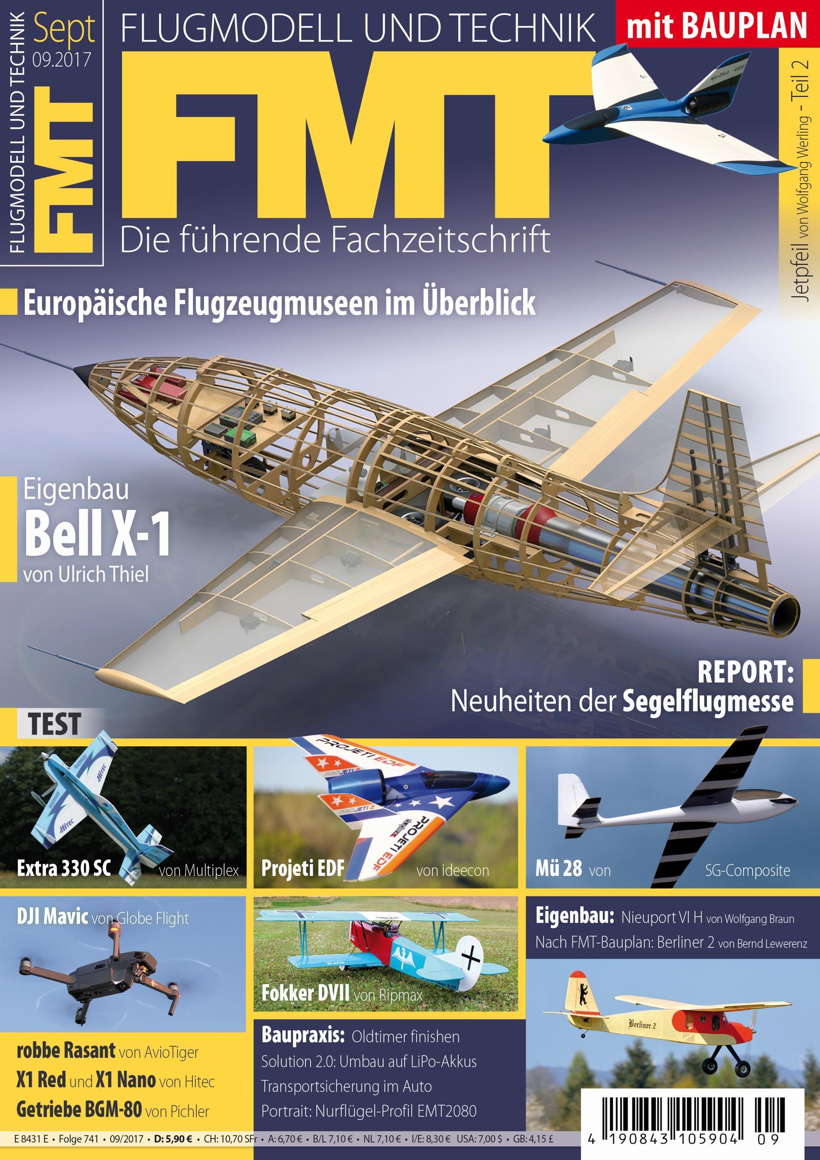 FMT-Autor Ulrich Thiel hat sich vor über zehn Jahren eine Bell X-1 komplett als Eigenbau vorgenommen, inklusive selbst konstruierter Turbine und Fahrwerk. Sein eindrucksvolles Ergebnis stellt er in der neuen FMT vor. Weitere Baupraxis-Themen in dieser Ausgabe: umfangreiches Update für das FMT-Bauplanmodell "Berliner", Oldtimer-Finish per Airbrush, Transportsicherung für Flugmodelle, LiPo-Umrüstung beim Simprop Solution 2.0. Außerdem gibt's einen Mega-Report zu den Neuheiten der Segelflugmesse 2017 und ein Special mit riesiger Übersicht zu Flugzeugmuseen in Deutschland und den Nachbarländern. Dr. Horst Torunski stellt in einem Grundlagen-Artikel sein Nurflügelprofil EMT2080 vor, als Bauplanbeilage findet sich in der FMT 09/2017 der zweite Teil des Jetpfeil. Getestet wurden: Extra 330SC Indoor Edition von Multiplex, Projeti EDF von Ideecon, Fokker D.VII von Ripmax, robbe Rasant von AvioTiger / Lindinger, DJI Mavic Pro von Globe Flight, Mü 28 von SG-Composite, das Getriebe BGM-80 1:1,6 von Pichler und die Ladegeräte Hitec X1 Nano und X1 Red von Multiplex.