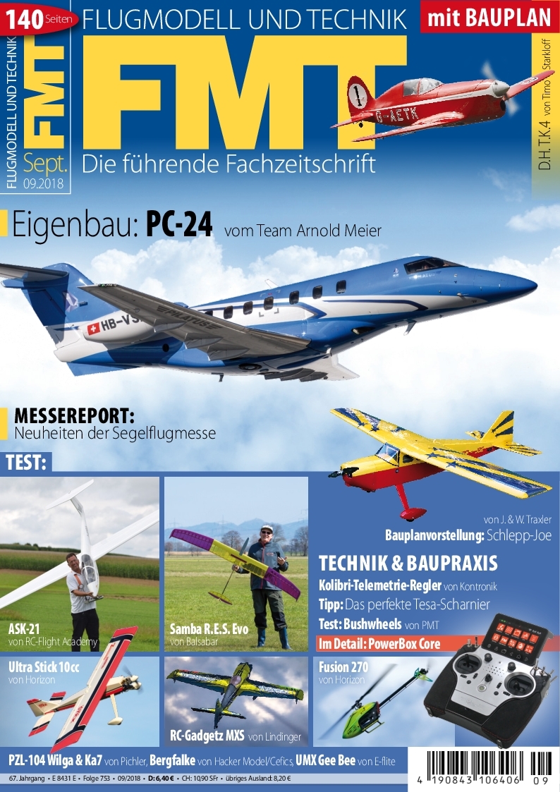 Mit der neuen PC-24 hat Pilatus erstmals einen Business-Jet entwickelt. Den wunderschönen Scale-Nachbau von Arnold Meier - drei Meter Spannweite, zwei Kolibri-Turbinen - porträtieren wir in der FMT 09/2018. Weitere Top-Themen der neuen Ausgabe: 9 Seiten Neuheiten-Report der Segelflugmesse in Schwabmünchen, Bauplanvorstellung des Schlepp Joe, CORE von PowerBox Systems, Test der Kolibri-Telemetrie-Regler von Kontronik, ASK 21 von RC-Flight-Academy, Ultra Stick 10cc von Hangar 9, Samba R.E.S. Evo von Balsabar, Bergfalke II/55 von Cefics, Blade Fusion 270 von Horizon Hobby, Ka 7 Rhönadler und PZL-104 Wilga von Pichler, UMX Gee Bee R-2 von E-flite, RC-Gadgetz MXS 56" von Lindinger. Als Beilagebauplan gibt es den zweiten Teil der de Havilland T.K.4.