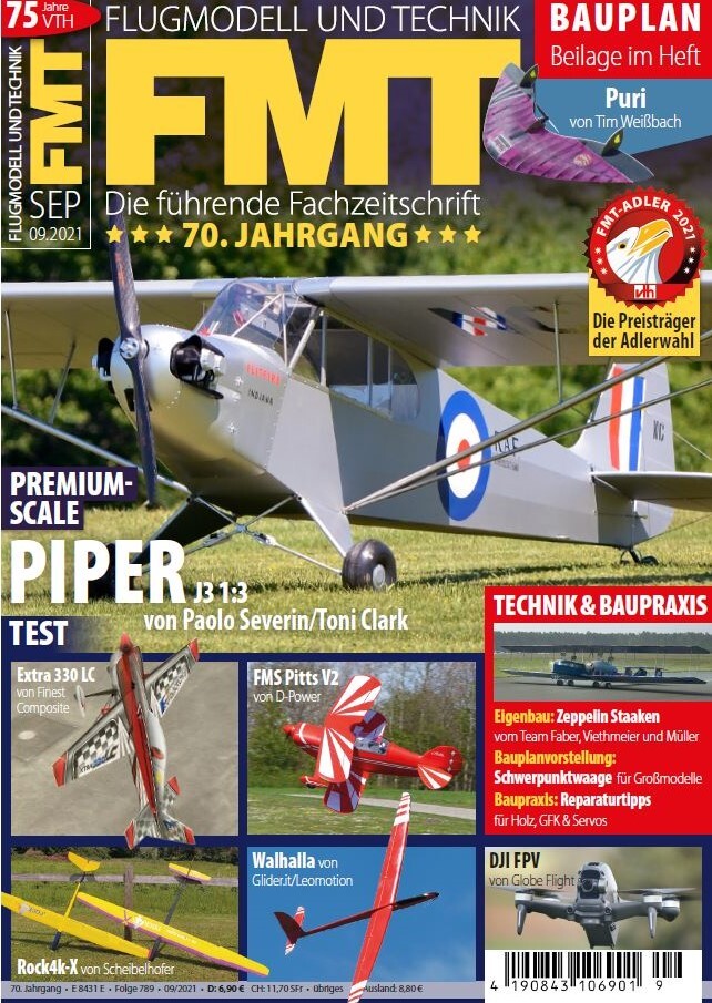 Fred Grunows Piper J-3 stammt von Paolo Severin/Toni Clark – und ist elektrisch. Wir berichten in der FMT 09/2021 über den Bau und die Ausrüstung des Großmodells im Maßstab 1:3. Weitere Top-Themen der neuen Ausgabe: Report der FMT-Adler-Verleihung, ARF-Reparaturtipps für Holz und GFK, elektronische Schwerpunktwaage im Eigenbau, Servogetriebe-Wechsel-Workshop, Zeppelin Staaken als Großmodell, FMS Pitts V2 von D-Power, Walhalla von Leomotion/Glider.it, Rock4k-X von rs-aero.com. Ein ganz besonderes Highlight ist der Puri von Tim Weißbach – unsere Bauplanbeilage. Das ist ein Spaßgerät für alle Fälle: Super-flexibel beim Antrieb, schnell aufgebaut, kompakt und preisgünstig. Einen Puri-Bausatz gibt's auch im VTH-Shop!