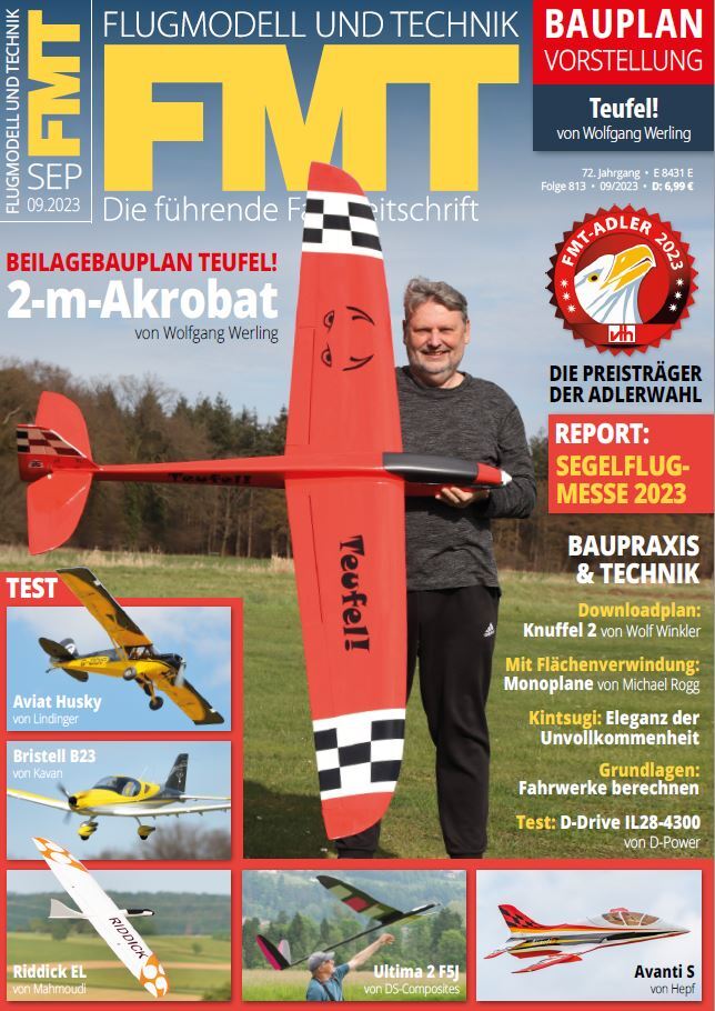 Teuflischer als das Teufelchen? Der Teufel! ist das neue Bauplanbeilagemodell von Wolfgang Werling, enthalten in der brandneuen FMT 09/2023. Auch als Bausatz im VTH-Shop ist der dynamische E-Segler schon zu haben! Weitere Top-Themen der aktuellen Ausgabe: Mega-Report der Segelflugmesse 2023 in Schwabmünchen, Riddick EL von Mahmoudi Modellsport, Ultima 2 von DS-Composites, Bristell B23 von Kavan, Seagull Aviat A-1C Husky von Lindinger, Downloadplan-Doppeldecker Knuffel 2.