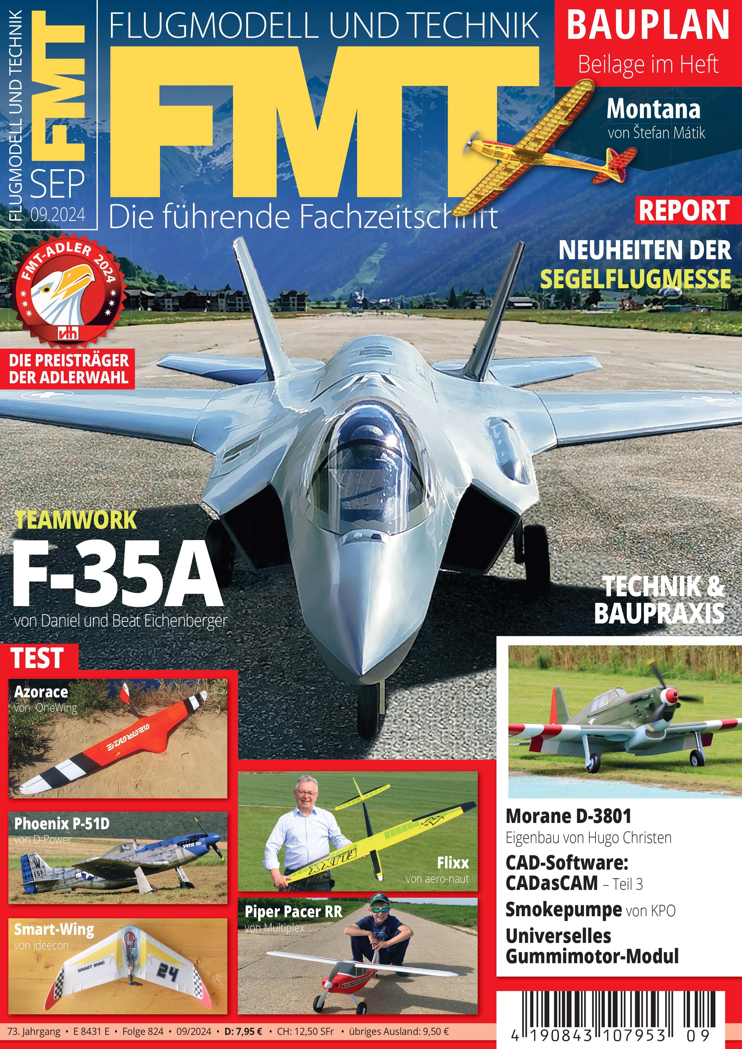 Die Lockheed Martin F-35A Lightning II ist das künftige Kampfflugzeug der Schweiz. Daniel und Beat Eichenberger haben sie jetzt schon als Eigenbau realisiert. Weitere Top-Themen der neuen Ausgabe: Morane D-3801 von Hugo Christen, Phoenix P-51 Mustang von D-Power, Piper Pacer von Multiplex, Flixx von aero-naut, Azorace von OneWing, Smoke-Pumpe von KPO, Reports zu den Modellbau Awards 2024 und den Neuheiten der Segelflugmesse 2024 in Schwabmünchen. Als Bauplanbeilage gibt's den wunderschönen Retro-Segler Montana 2.2 von Štefan Mátik.