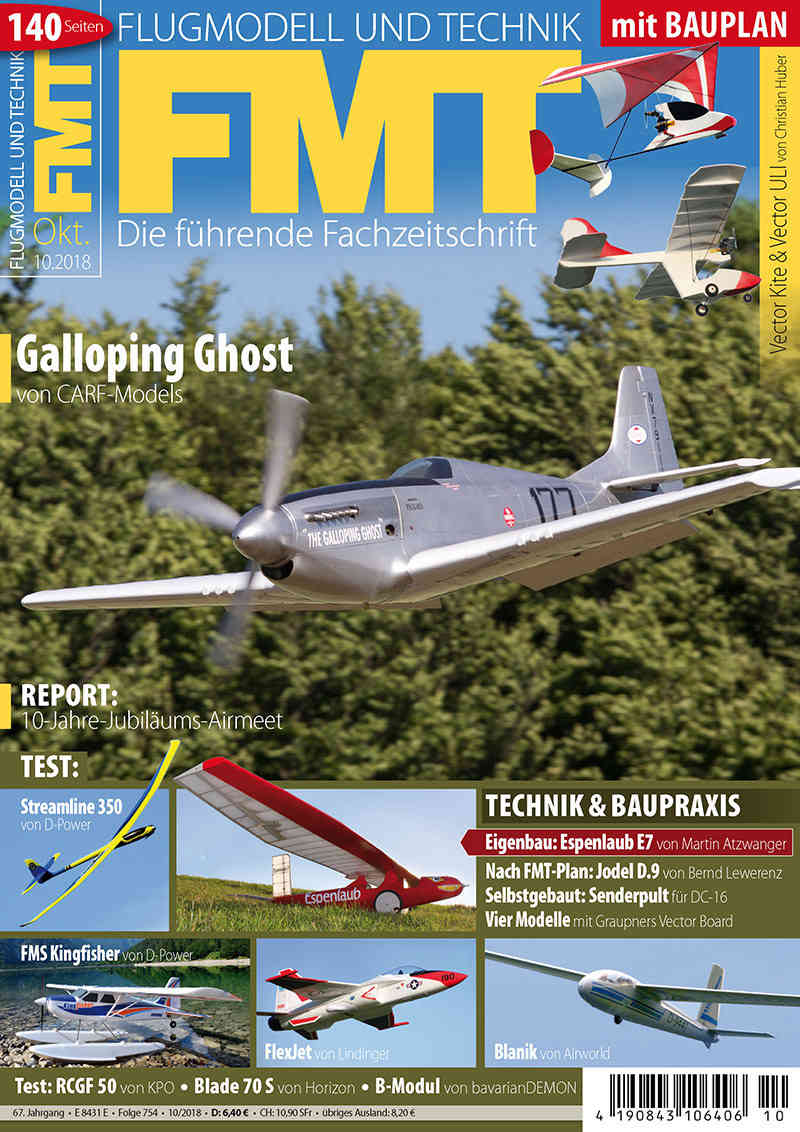 In der neuen FMT 10/2018 testen wir den legendären Air-Racer Galloping Ghost von CARF-Models. Pflichtlektüre! Eine kleine Auswahl der weiteren Tests: RCGF-50-Boxermotor von KPO, B-Modul von bavarianDEMON, Streamline 350 von D-Power, Blanik L-13 von Airworld, Premier Aircraft FlexJet von Lindinger und FMS Kingfisher von D-Power. Baupraktisch geht's genau so heftig zur Sache mit einem Eigenbau-Senderpult für die Jeti DC-16, einem Eigenbau der Espenlaub E7, dem Porträt der nach einem FMT-Bauplan entstandenen Jodel D.9 BéBé und natürlich der aktuellen Bauplanbeilage: vier Modelle aus Vector Board, dem innovativen neuen Werkstoff von Graupner.