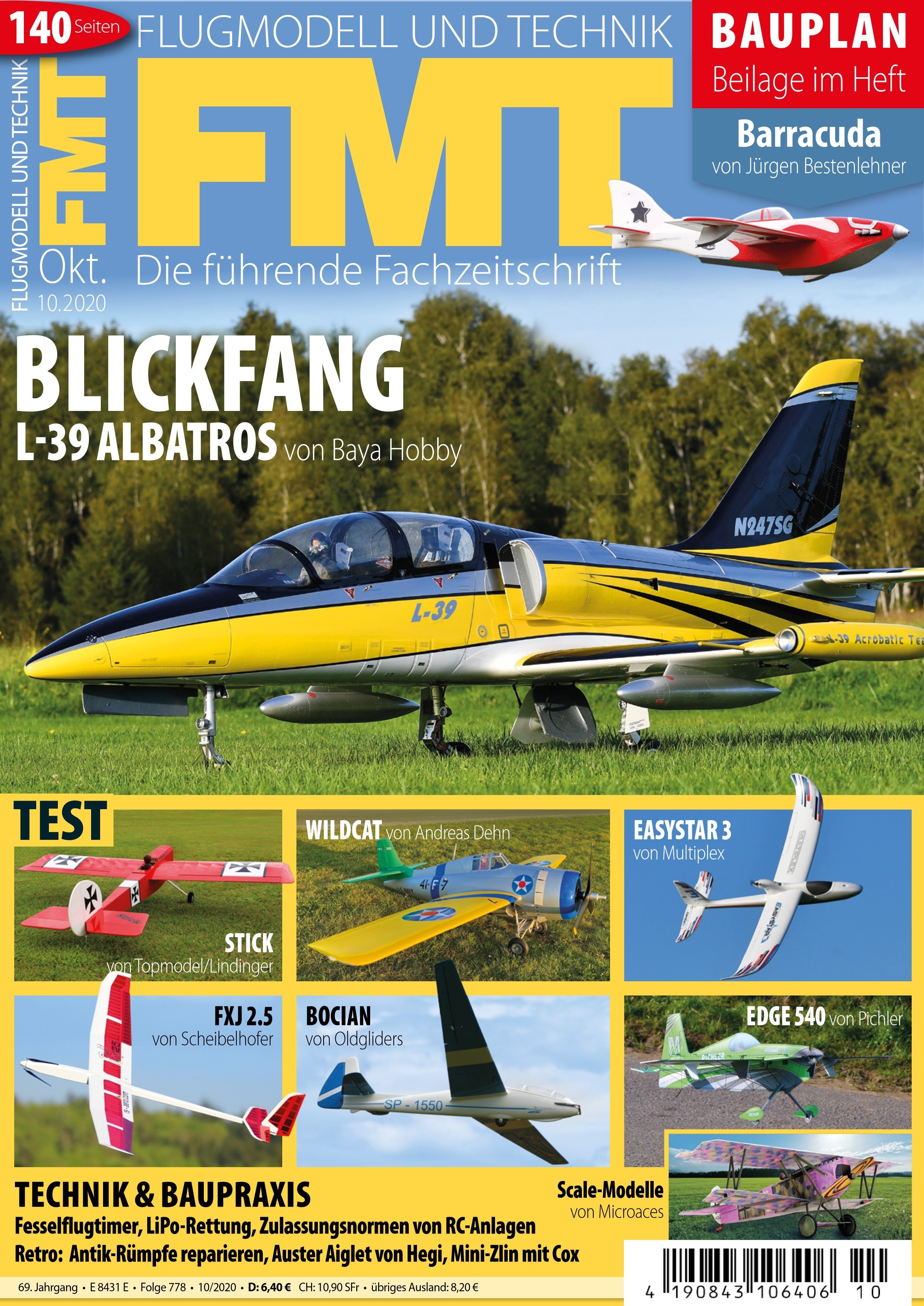 Schon ab Werk kommt sie mit vielen Scale-Details, Bernd Neumayr hat’s dabei aber nicht belassen: die L-39 von Baja Hobby/Kingtech mit zwei Meter Spannweite, das Titelmodell der FMT 10/2020. Weitere Highlights der neuen Ausgabe: Grumman F4F Wildcat von Andreas Dehn, Retro-Zlin XII mit Cox-Motor, Stick von Lindinger, EasyStar 3 von Multiplex, FXJ 2.5 von rs-aero.com, SZD-9 Bocian von Oldgliders. Im großen baupraktischen Teil gehts unter anderem um die Rumpfreparatur, die Umrüstung eines F5J-Seglers zum Riesen-HLG und um die Rettung tiefentladener LiPos. Bauplanbeilage ist das Amphibienmodell Barracuda von Jürgen Bestenlehner, zu dem es auch einen Komplettbausatz im VTH-Shop gibt. Übrigens: Die FMT 10/2020 ist im Zeitschriftenhandel auch als Vorteilspreis-Bundle zusammen mit dem FMT-Extra Segelflug 2020 erhältlich!