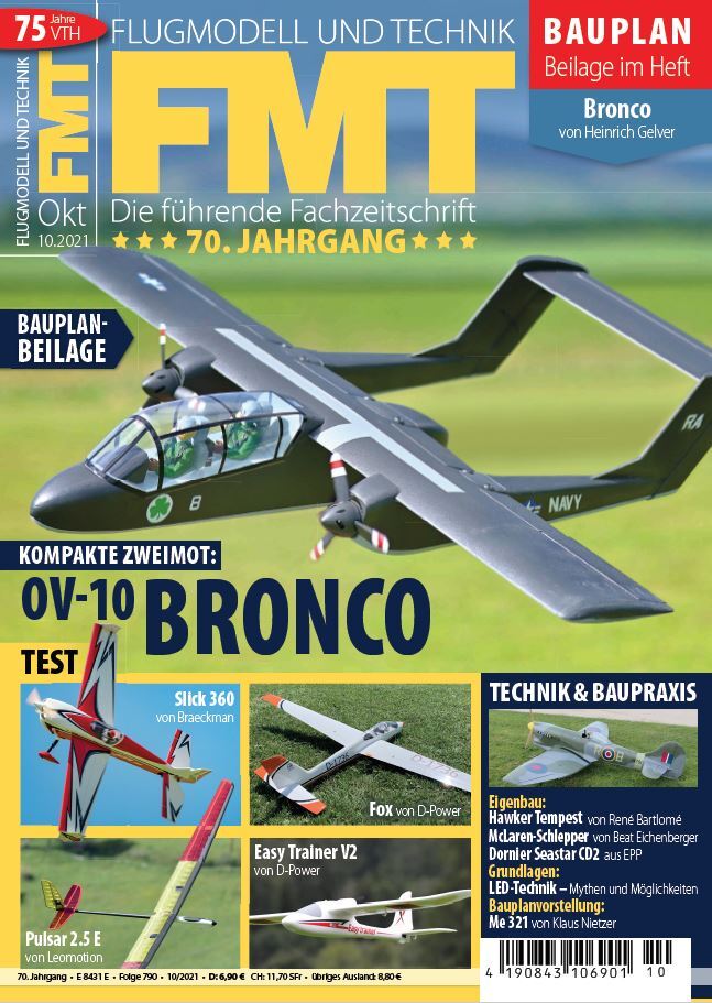 Heinrich Gelvers wunderschöne und traumhaft fliegende Rockwell OV-10 Bronco ist das Bauplanbeilage-Modell der FMT 10/2021, zu dem es auch einen Bausatz gibt. Weitere Highlights der neuen Ausgabe: Grundlagen-Artikel zur LED-Technik, Retroday in Pfäffikon/Schweiz, CARF-Team-Meeting, Wiederaufbau einer Hawker Tempest Mk V von René Bartlomé und viele aktuelle Testberichte: Pulsar 2.5 E von Leomotion, Fox von D-Power, Para-RC Cloud 1.5 von Hacker Motor, Slick 360 73“ von Skywing/Braeckman.