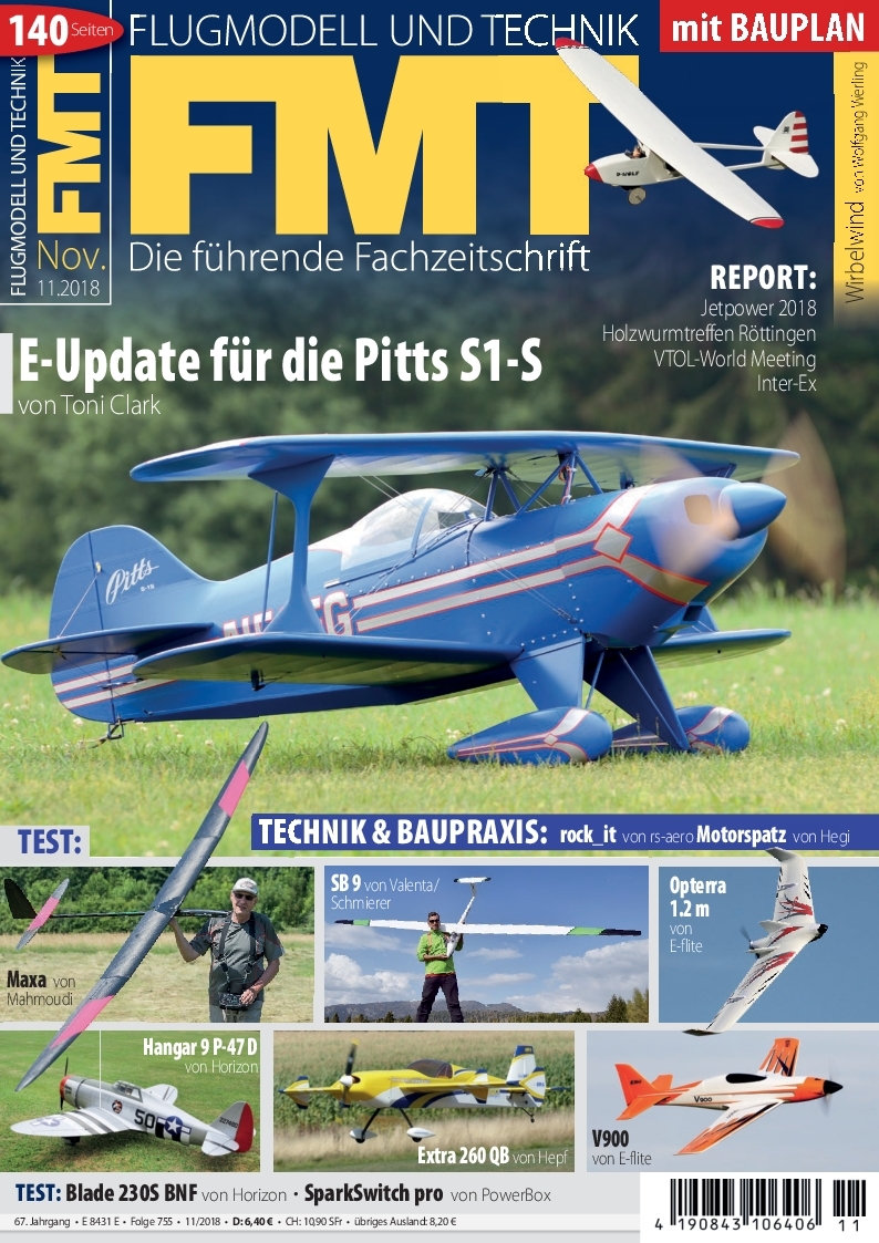 Covermotiv der neuen FMT 11/2018 ist die Pitts S1 von Toni Clark Practical Scale, elektrisch angetrieben von einem Hacker A80-10. Alles zum E-Umbau steht in der neuen Ausgabe. Weitere Top-Themen: JetPower in Donauwörth-Genderkingen, Holzwurmtreffen Röttingen 2018, Inter-Ex 2018 in Vaihingen/Enz, World Meeting für VTOL-Modelle, P-47D Thunderbolt von Hangar 9, 30cc Freestyle Extra 260 QB-L von Hepf, SB 9 von Valenta/Schmierer, Maxa Pro EL 4.0 Megalight von Mahmoudi, V900 von E-flite, Rock_it von Scheibelhofer. Aktuelle Bauplanbeilage ist der erste Teil des Wirbelwind EDF von Wolfgang Werling.