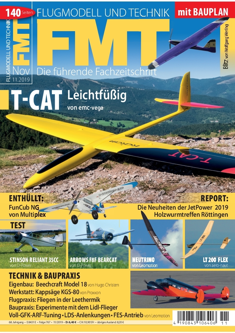 Für den wilden Ritt am Hang ist sie gebaut, die neue T-Cat von emc-vega. Wir lassen’s in der FMT 11/2019 krachen mit dem 1,88-m-Voll-CFK-Segler. Weitere Highlights der neuen Ausgabe: Exklusiv-Preview zur FunCub NG von Multiplex, Report der JetPower 2019 in Donauwörth/Genderkingen, Einbau von LDS-Anlenkungen, Neutrino von Jim Aero/Leomotion, Stinson Reliant 35cc von D-Power, LT 200 Flex von aero-naut, KGS 80 von Proxxon, Beech-18-Eigenbau von Hugo Christen, Nurflügel-Hotliner Blitz von Wolfgang Werling als Bauplanbeilagemodell.