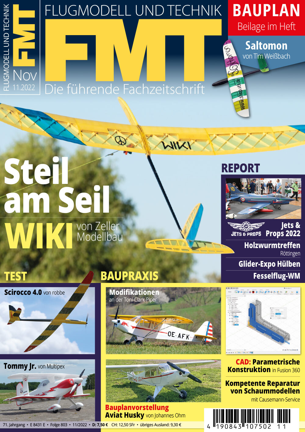 Mit geodätischem Flächenbau und einem extrem schlanken, F3J-ähnlichen Rumpf: Die Wiki von Zeller Modellbau fällt auf. Aber wie gut ist der neue RES-Segler? Das finden wir in der FMT 11/2022 heraus. Weitere Top-Themen der neuen Ausgabe: Messe-Reports zur Jets&Props und Glider Expo Hülben, Toni-Clark-Piper von Fred Grunow, Scirocco L von robbe, Tommy Jr. von Multiplex und als Bauplanbeilage gibt's den vergnüglichen Saltomon von Tim Weißbach, ein potenter Kleinsegler, der auch als Frästeilesatz erhältlich ist.