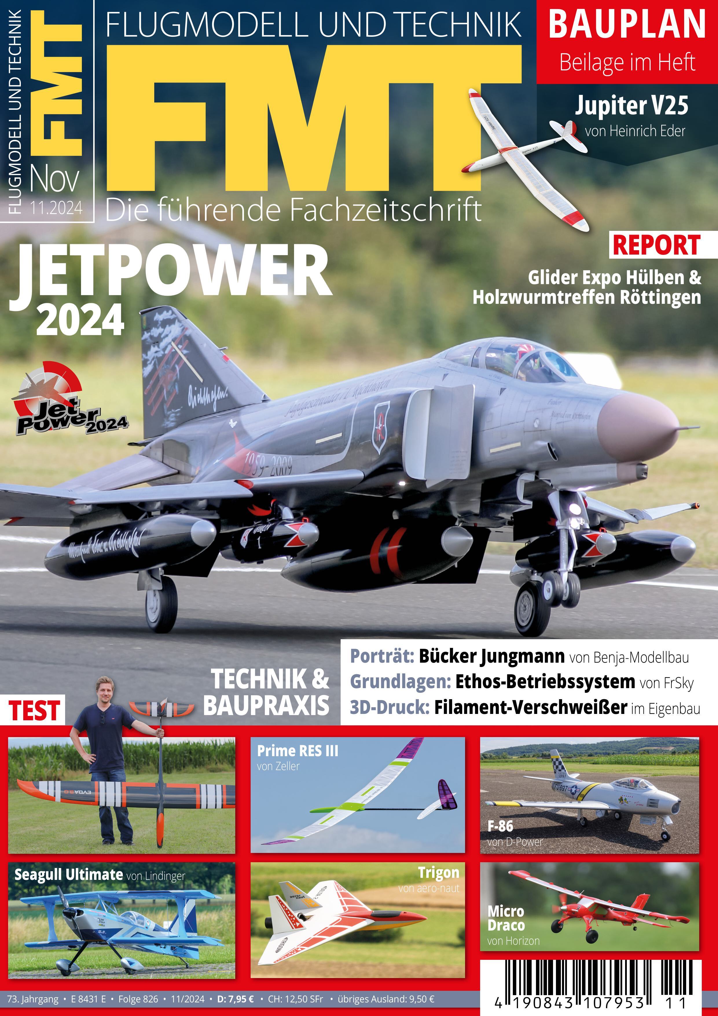 Zurück zum Ursprung: Die JetPower fand 2024 mit neuem Veranstalter wieder in Reinform statt, in Breitscheid. Wir waren dabei – und berichten in der neuen Ausgabe von Airshow und Messe. Weitere Top-Themen der FMT 11/2024: Delta 24 Trigon von aero-naut, Bücker Jungmann von Benja, Seagull Ultimate 54,3" von Lindinger, FMS F-86 von D-Power, E-flite Micro Draco von Horizon Hobby, Prime RES III von Zeller Modellbau, Evoa 3.0 PNP von robbe. Als Bauplanbeilage gibt's den schönen Jupiter V25 als Retro-Neuauflage, der im VTH-Shop auch als Teilesatz erhältlich ist.