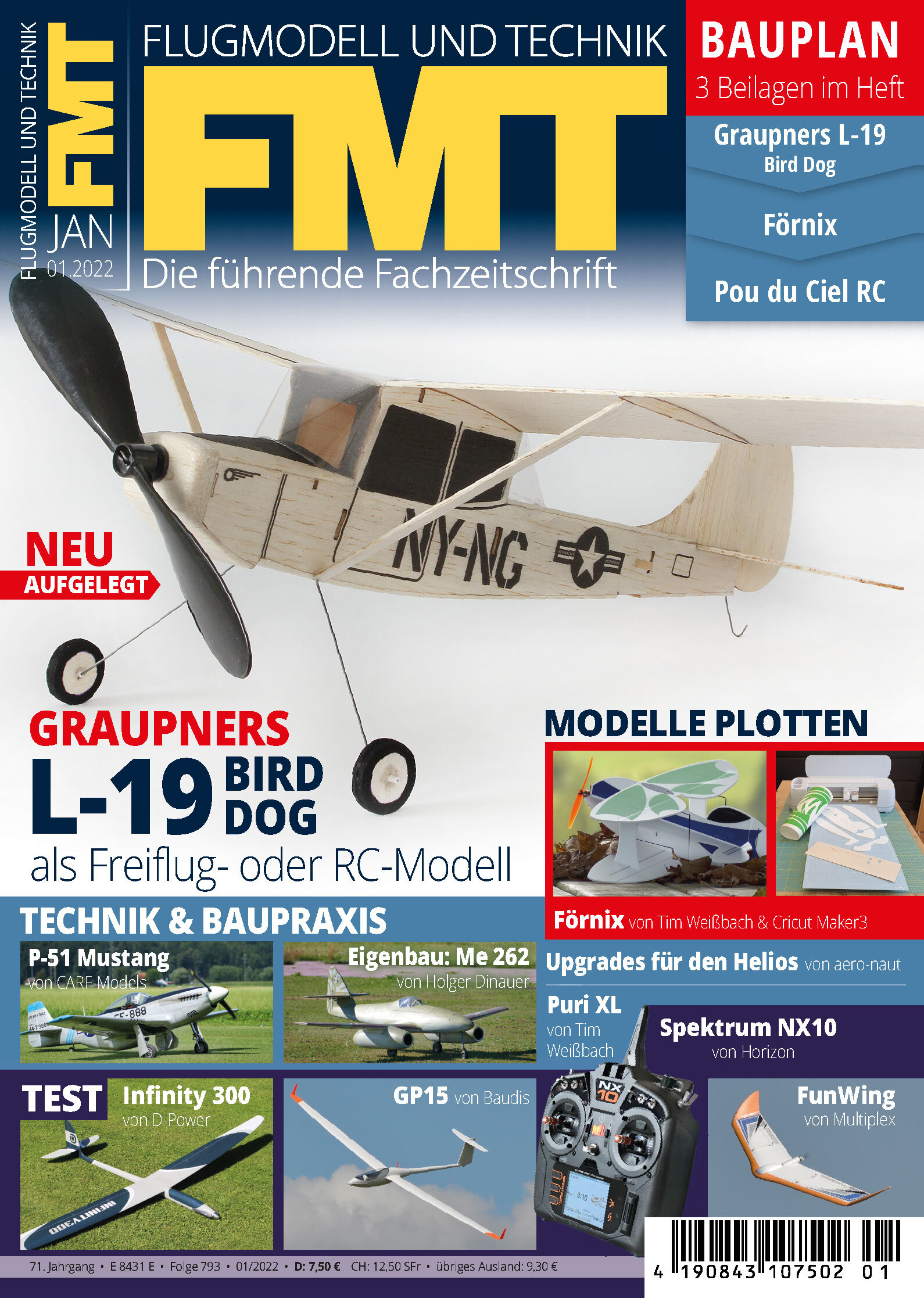 Wir haben die Graupner-Legende neu aufgelegt! Die Cessna L-19 Bird Dog ist Bauplanbeilagemodell der FMT 1/2022. Sogar als Bausatz ist sie im VTH-Shop erhältlich. Damit nicht genug: Der Förnix von Tim Weißbach und der Pou du Ciel von Heinrich Eder sind weitere Bauplanbeilagemodelle der aktuellen FMT - und auch vom Förnix gibt es im VTH-Shop einen Teilesatz. Weitere Top-Themen der FMT 1/2022: Puri XL von Tim Weißbach (auch den gibt's schon als Bausatz!), P-51D Mustang von CARF Models, GP 15 Jeta von Baudis, Upgrades für den Helios von aero-naut, Turbulatoren für Flugmodelle. Und vieles mehr!