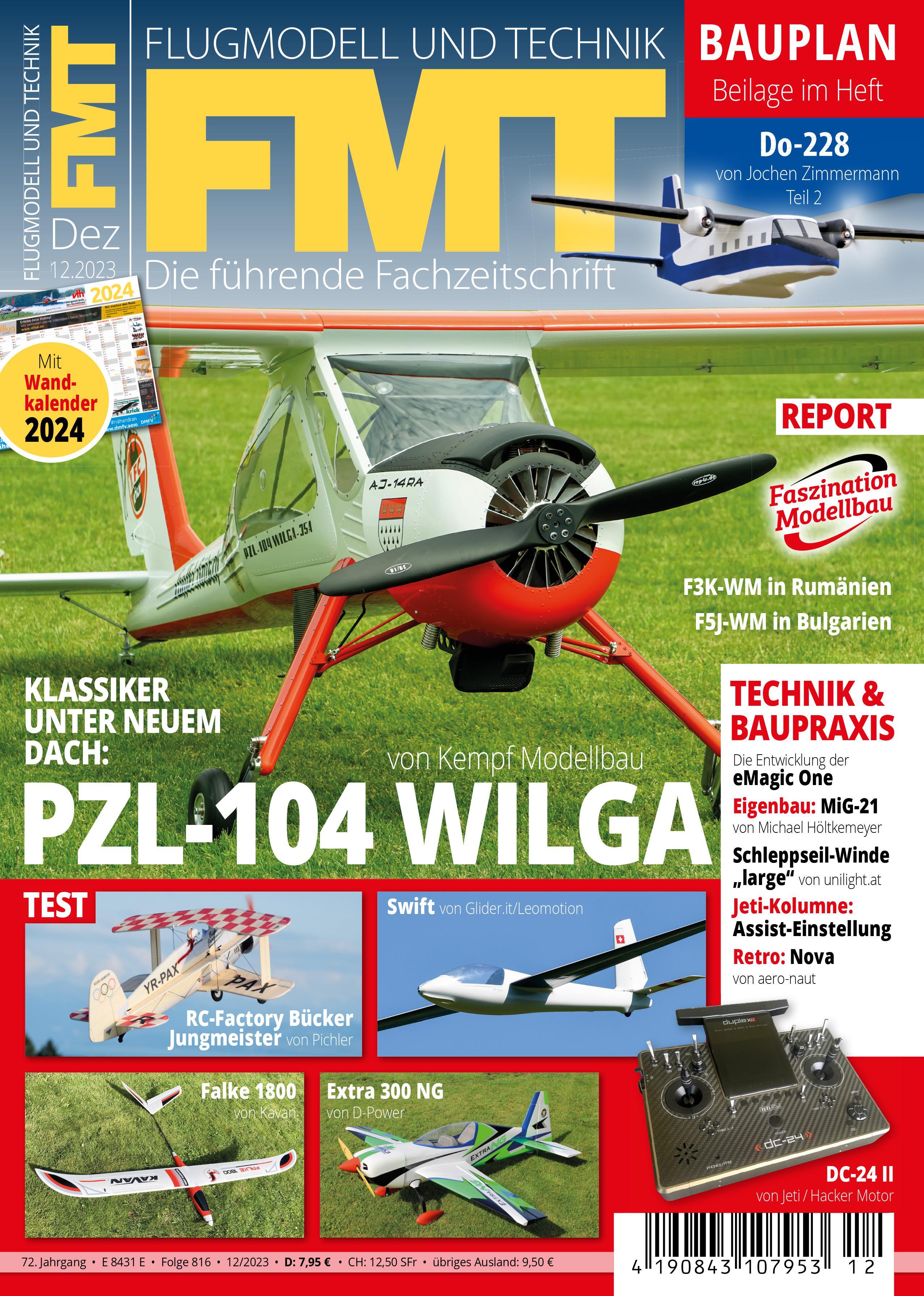 Die legendäre Frisch-Wilga ist bei Kempf Modellbau wieder zu haben! Die Neue stellen wir in der FMT 12/2023 detailliert vor. Weitere Top-Themen der Ausgabe: Jeti DC-24 II von Hacker Motor, Swift S1 von Glider.it/Leomotion, Extra 300 NG von D-Power, Falke 1800 von Kavan, Schleppseil-Winde Large von Unilight.at, MiG-21-Eigenbau im Maßstab 1:7 aus Holz. Als Bauplanbeilage gibt's den zweiten Teil der Dornier 228 von Jochen Zimmermann.