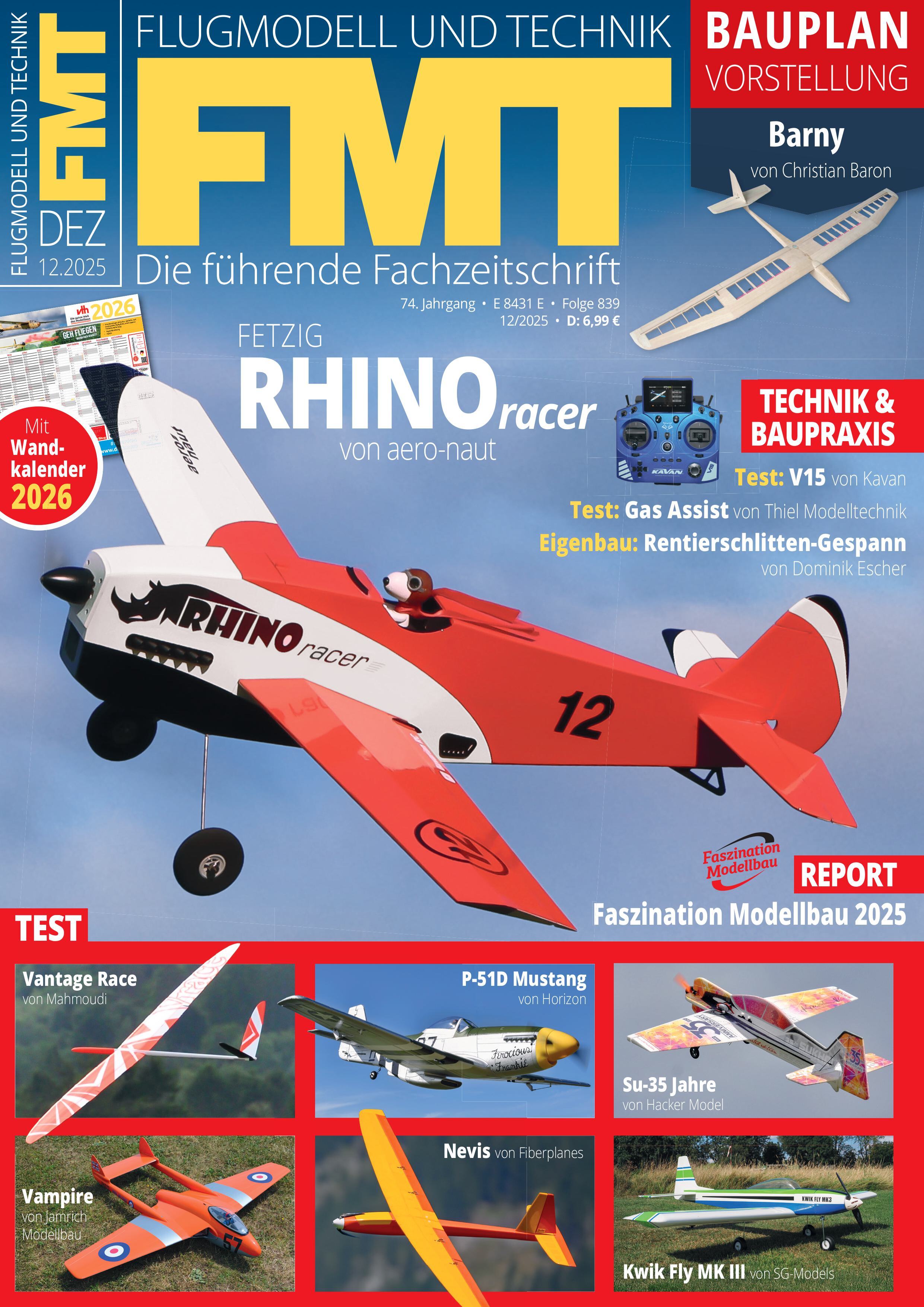 Ist der Rhino Racer das richtige Modell für den schnellen Spaß? Wir testen den klassisch in Holz aufgebauten Neuen von aero-naut in der FMT 12/2025. Weitere Top-Themen der neuen Ausgabe: Kwik Fly MK III von Seagull Models, DH100 Vampire von Jamrich, Nevis von Fiberplanes, E-flite P-51D Mustang 1.0m von Horizon, Vantage Race von Mahmoudi, V15 von Kavan, Reports der Faszination Modellbau Friedrichshafen, der F3B-Weltmeisterschaft in Nardt und der F3K-Weltmeisterschaft in Tarp. Als aktuelle Bauplanbeilage gibt's den Allroundsegler Barny, der auch als DXF-Datensatz im VTH-Shop erhältlich ist.