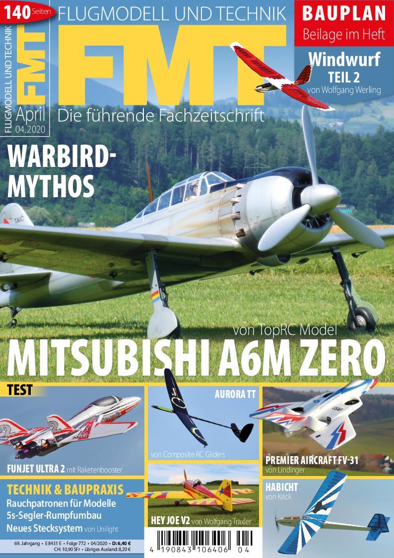 Viel Zeit zu Hause? Da kommt die FMT 4/2020 gerade richtig! Die neue Ausgabe ist vollgepackt mit ganz viel Baupraxis: Bauplanvorstellung Hey Joe V.2, Bauplanbeilage Windwurf (Teil 2), einer 5s-(!)Rumpfmodifikation für F3F-Segler, Experimente mit Rauchpatronen von Klima, FunJet Ultra 2-Umbau mit Raketen-Booster. Im Test: Mitsubishi A6M5 Zero von TopRC Model, Phoenix Aurora F3A von D-Power, uniCONNECT-System von uniLIGHT, Pinocchio 2,8 m von more than scale composite, Habicht von Krick, Aurora TT von Composite RC Gliders, Premier Aircraft FV-31 Cypher von Lindinger. Und vieles mehr! Tipp: Die FMT 04/2020 ist im Zeitschriftenhandel ab 26.3.2020 auch als Bundle zusammen mit dem FMT-Extra RC-Elektronik 2020 erhältlich.