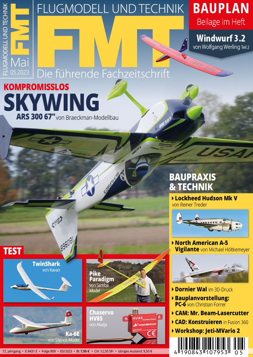 Bauplanbeilage der FMT 5/2023 ist der zweite Teil des Nurflügel-Floaters Windwurf 3.2 von Wolfgang Werling, der im VTH-Shop als Teilesatz erhältlich ist. Die neue FMT 5/2023 ist portofrei ab Verlag verfügbar und ab 27.4.2023 im Handel. Die FMT 6/2023 erscheint dann am 25.5.2023.