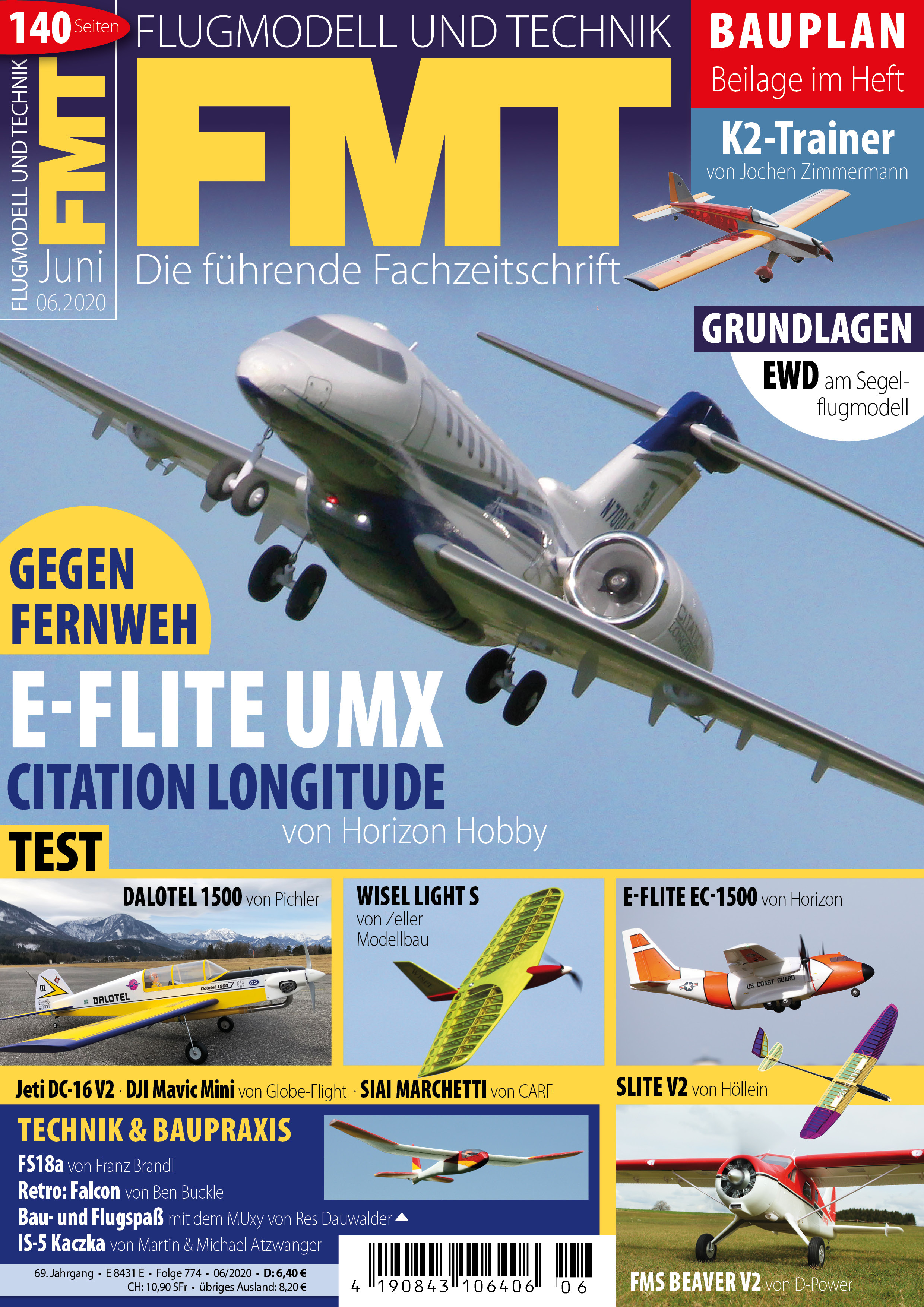Ist sie der Höhepunkt der UMX-Modellreihe? Wir testen in der FMT 6/2020 die UMX Citation Longitude von E-flite. Weitere Highlights der neuen Ausgabe: Dalotel 1500 von Pichler, SIAI Marchetti SF-260 von CARF, Slite V2 von Höllein als E-RES-Umbau, Jeti DC-16 II von Hacker Motor, Falcon von Ben Buckle Vintage Kits, Grundlagenartikel zur EWD am Segelflugmodell und K2-Trainer von Jochen Zimmermann als Bauplanbeilage.