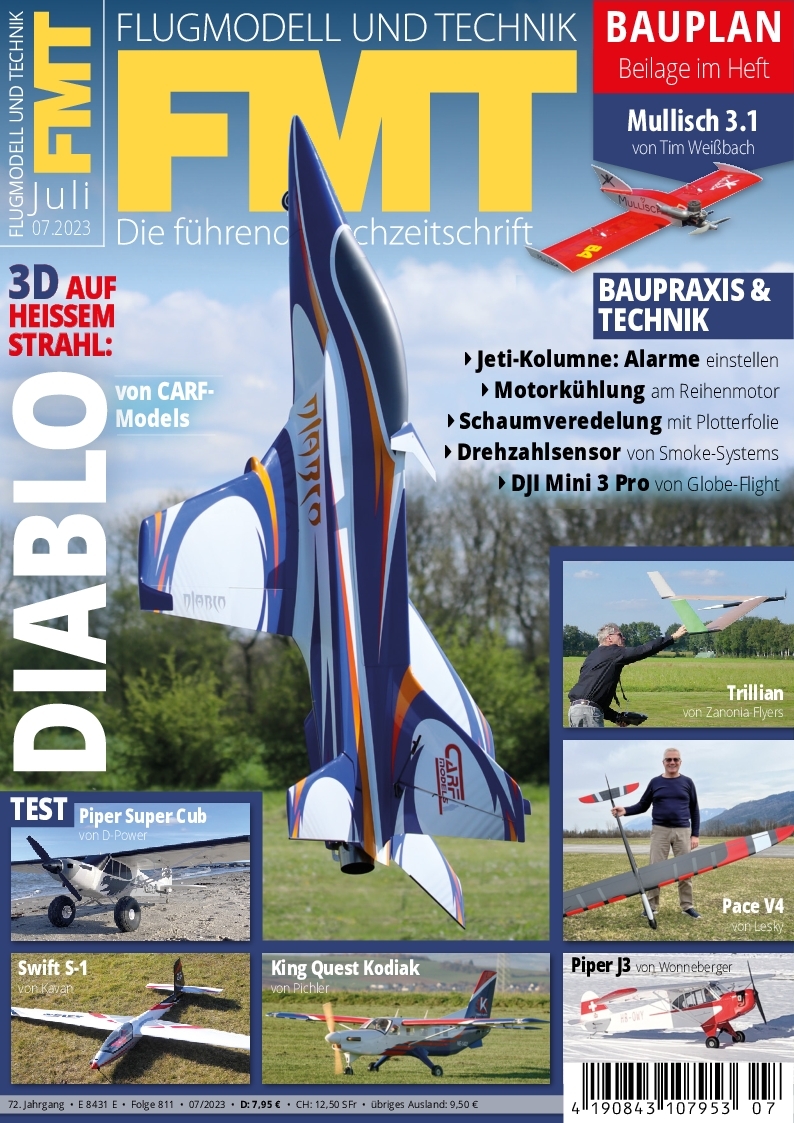 Der Diablo ist ein kleiner Mephisto. Wir klären in der FMT 07/2023, was CARFs neuen 3D-Sportjet von seinem großen Bruder unterscheidet. Weitere Top-Themen der neuen Ausgabe: Pace V4 von Lesky Composite, Piper J3 von Wonneberger, Trillian von Zanonia-Flyers, FMS Piper PA-18 Super Cub von D-Power, E-Purito von Holzmodellbau Schweiger und Swift S-1 von Kavan. Als Bauplanbeilage gibt's den Club-Pylon-Racer Mullisch 3.1 von Tim Weißbach, der im VTH-Shop als Holzbausatz erhältlich ist.