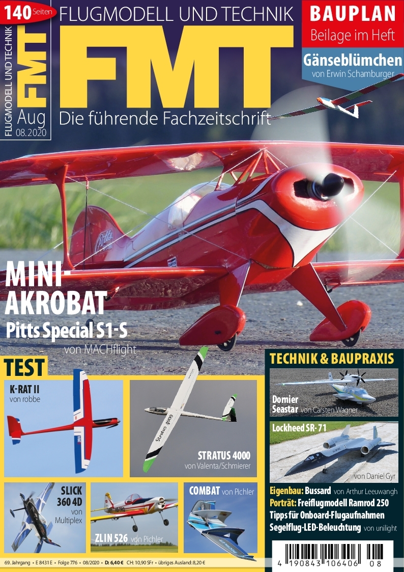 Klein, heiß und rot ist das Titelmodell der FMT 8/2020. Dabei hat die Pitts Special S1-S von MACHflight nur 40 cm Spannweite und ist komplett aus Holz gebaut. Weitere thematische Highlights der neuen Ausgabe: Tests von Zlin Z-526 Akrobat von Pichler, Slick X360 4D von Multiplex, Stratus 4000 von Schmierer/Valenta, K-RAT II von robbe. Außerdem: Dornier Seastar CD2, Lockheed SR-71, Bussard-Vogelmodell und Trike für Para-RC Cloud 0.5 als Eigenbauten. Als Bauplanbeilage gibt's in diesem Monat das Gänseblümchen, ein sehr attraktiver, gutmütiger Zweimeter-Segler.