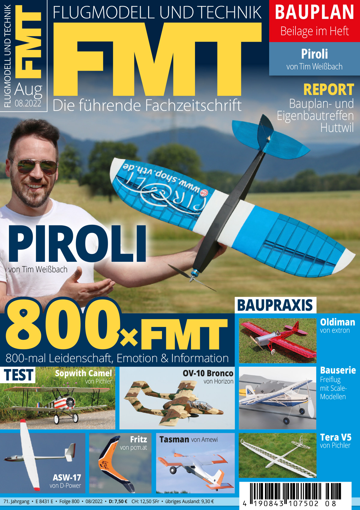 Die FMT 8/2022 ist die 800. Ausgabe! Wir feiern dieses unglaubliche Jubiläum mit einer erfrischenden Sommerausgabe und einem herrlichen Bauplanbeilagemodell: dem Piroli von Tim Weißbach. Einige der Top-Themen: Bauplan- und Eigenbautreffen Huttwil, Oldiman von Extron, OV-10 Bronco 30cc von Hangar 9, Sopwith Camel und Tera V5 von Pichler, Fritz von pcm.at, ASW-17 von D-Power, AMXPlanes Tasman von Amewi, Restauration Canadair CL-415, Ultraleicht-Heli im Eigenbau.