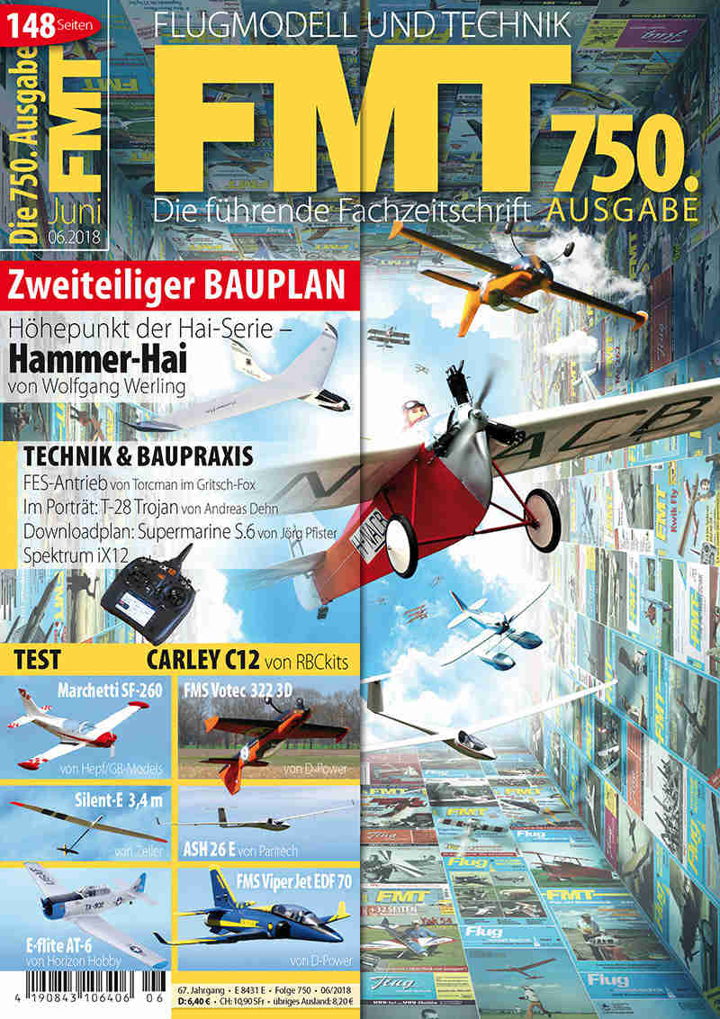 Die FMT 06/2018 ist die 750.-FMT-Ausgabe. Die Siebenhundertfünfzigste. Was für eine Zahl, was für ein Jubiläum! Wo gibt es in unserer heutigen, schnelllebigen Zeit noch so etwas? Mit vielen Goodies feiern wir dieses Jubiläum, etwa mit dem zweiteiligen Bauplan des Hammer-Hai oder dem kostenlosen Downloadplan der Supermarine S.6. Natürlich gibt es auch viele prominente Wegbegleiter aus der Branche, die der FMT gratulieren und deren Grüße wir in der aktuellen Ausgabe abdrucken.
