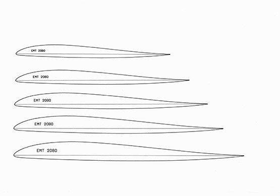 Das von Dr. Horst Torunski entworfene, 8% dicke EMT2080 setzt er in einer mittlerweile zehnjährigen Praxisphase in drei Brett- und einem Pfeilnurflügel ein. Drei weitere „Bretter“ kamen in einer 8,8% dicken Variante dazu, mit Spannweiten von 1,8 bis 4,2 m und Flächenbelastungen von 16 bis 31 g/dm2. Kurzum: Es hat sich bewährt. In der FMT 09/2017 stellen wir das Profil detailliert vor, alle Daten dazu gibt’s hier kostenfrei zum Download.
