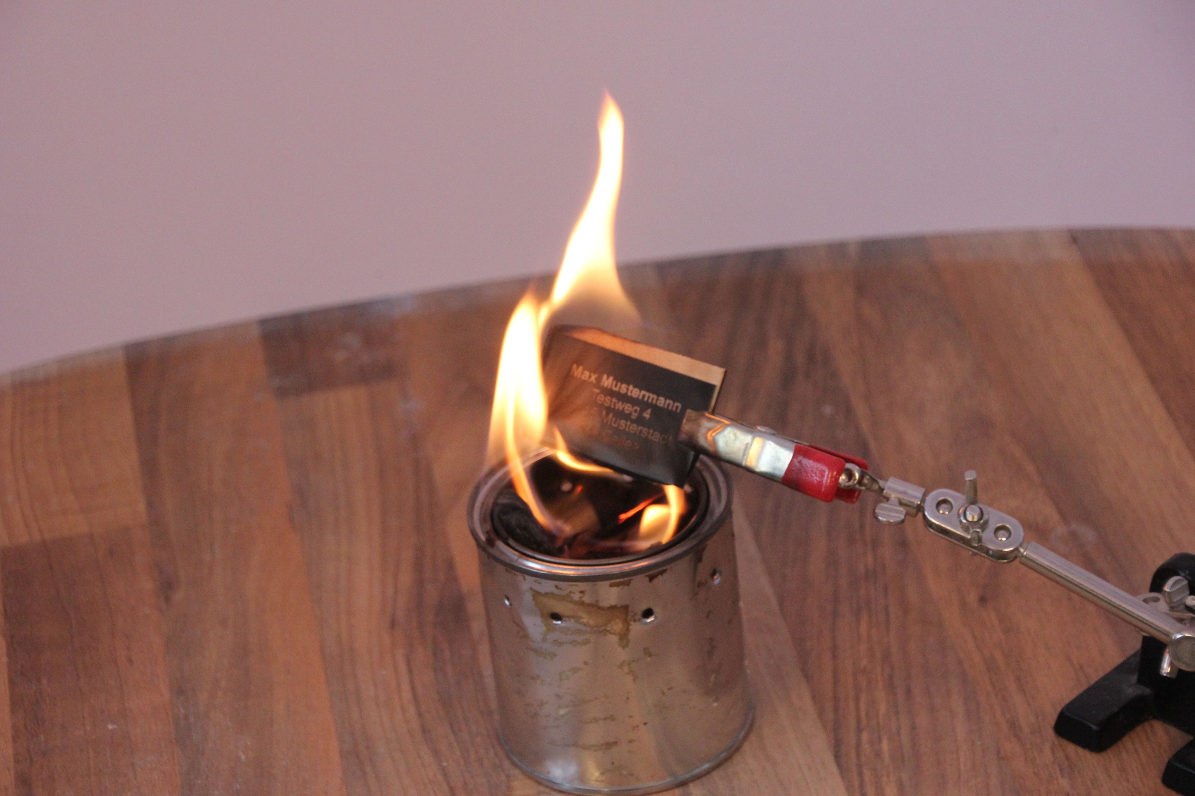 Aufgeklebt auf ein Stück Sperrholz wurden die Schilder rund fünf Minuten den Flammen ausgesetzt und anschließend begutachtet. Selbst die 0,1 mm dünnen und nur knapp 0,1 g schweren Schilder waren nach dieser Tortur noch gut lesbar, die größeren Aluschilder überstanden das ganze sogar nahezu unbeschadet, so dass sie für ein Einsatz in Modellen mit Verbrennungsmotoren die bessere Wahl sind, da hier durch den mitgeführten Kraftstoff bei einem Feuer höhere Temperaturen über einen längeren Zeitraum auftreten können.