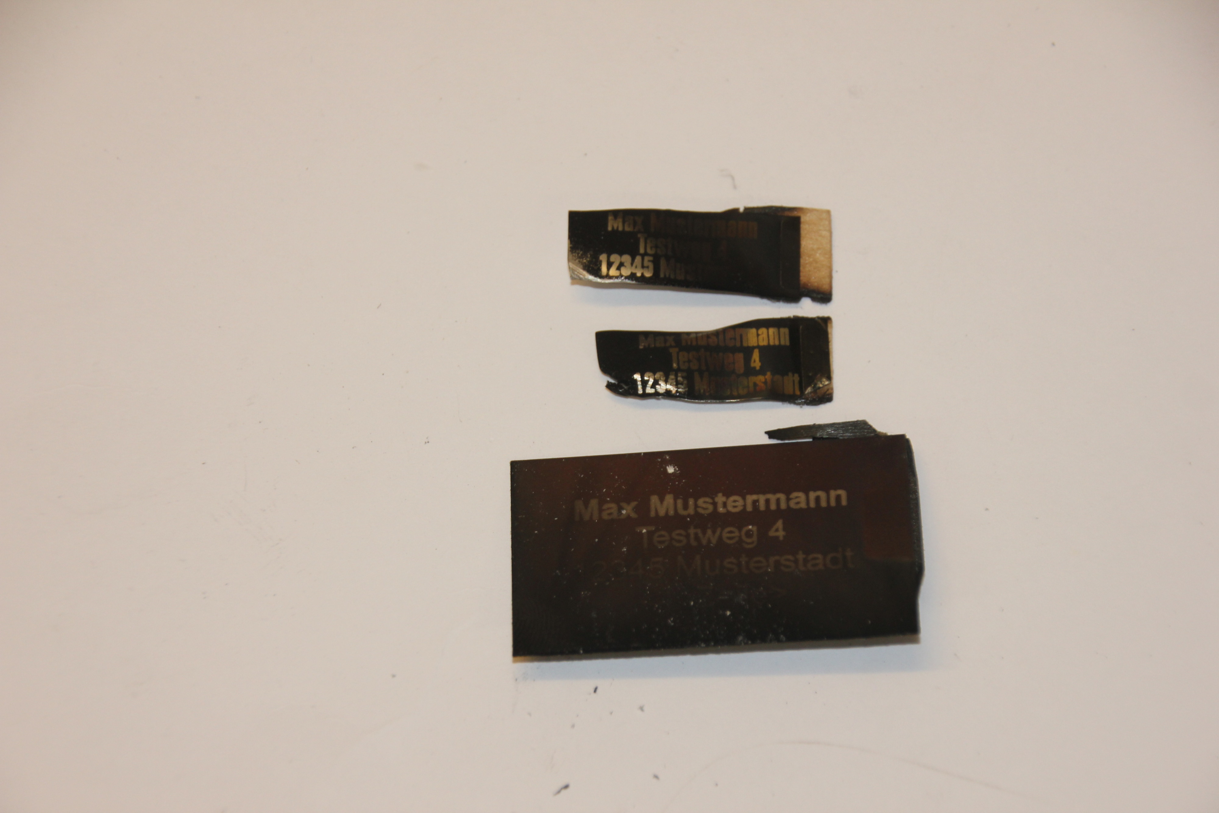 Hierzu gibt es im Gesetzestext keine eindeutige Definition, laut dem Deutschen Modellflieger Verband (DMFV) ist dies so zu verstehen, dass die Schilder einen Brand des Modells an sich überstehen und danach noch lesbar sein müssen. Dieser Anforderung sollten alle gängigen Schilder aus Aluminium oder Edelstahl entsprechen. In einem Versuch habe ich die im VTH-Shop angebotenen Schilder (30 × 12 × 0,1 mm und 50 × 30 × 0,5 mm) einem Härtetest unterzogen, um genau diese Vorgabe sicherzustellen.