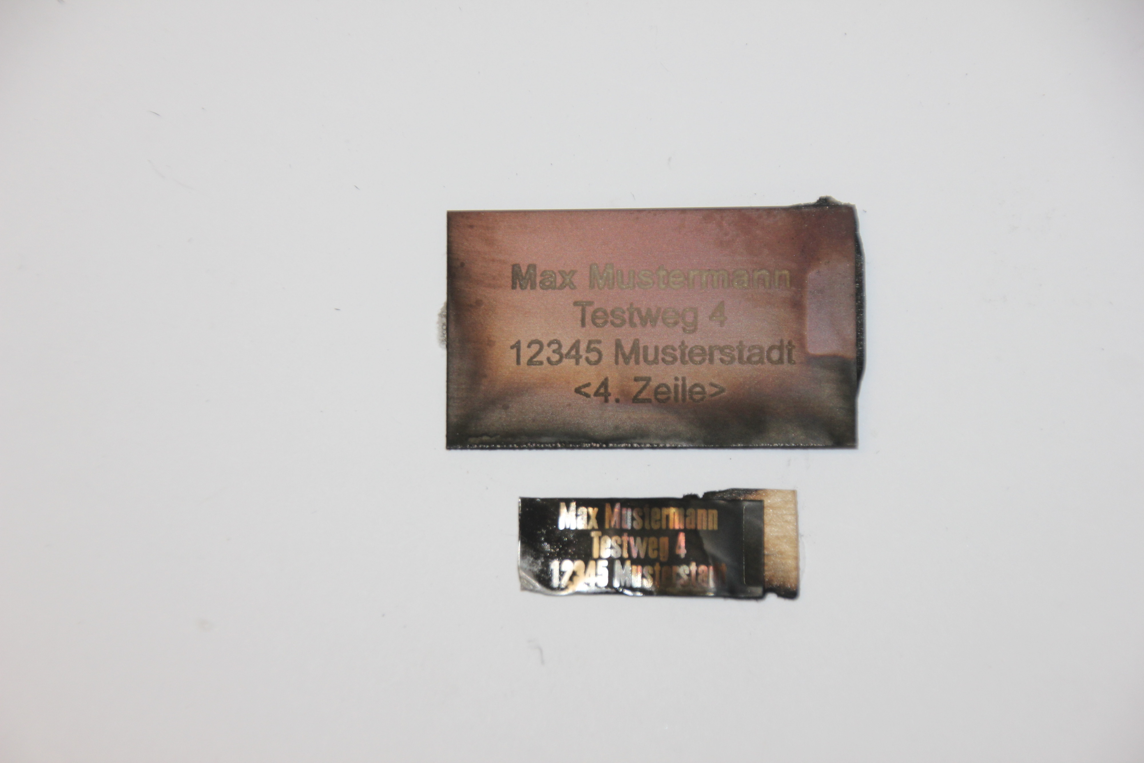 Hier sieht man die beiden Schilder nach dem Brenntest, die dünnen Schilder sind etwas mitgenommen, aber immer noch gut lesbar, die dickeren Schilder überstanden den Test nahezu unbeschadet.