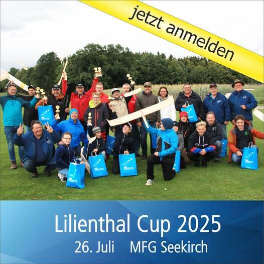 Der Lilienthal 40 Cup 2025 findet am 26. Juli 2025 auf dem Modellflugplatz der MFG Seekirch e.V. statt! Der Wettbewerb wird in drei Klassen ausgetragen: RC Segelflug mit Seilstart für Jugendliche bis 16 Jahre, RC Segelflug mit Seilstart für Modellflieger ab 17 Jahren sowie RC Elektrosegelflug für Jugendliche und Modellflieger ab 17 Jahren. Alle Teilnehmer müssen über eine gültige Versicherung verfügen und den entsprechenden Nachweis vor Beginn des Wettbewerbs vorlegen. Der Anmeldeschluss ist am Freitag, 18. Juli 2025 (8 Tage vor dem Wettbewerb). Anmeldungen sind zu richten an Benni Miehle (Tel. 0152 0381 5225, Email: benjamin@miehle-it.de). Die Anmeldung erfolgt über das offizielle Anmeldeformular des DMFV: www.dmfv.aero/wp-content/uploads/2025/03/Anmeldung-zum-Lilienthal-40-Cup-2025_interaktiv.pdf