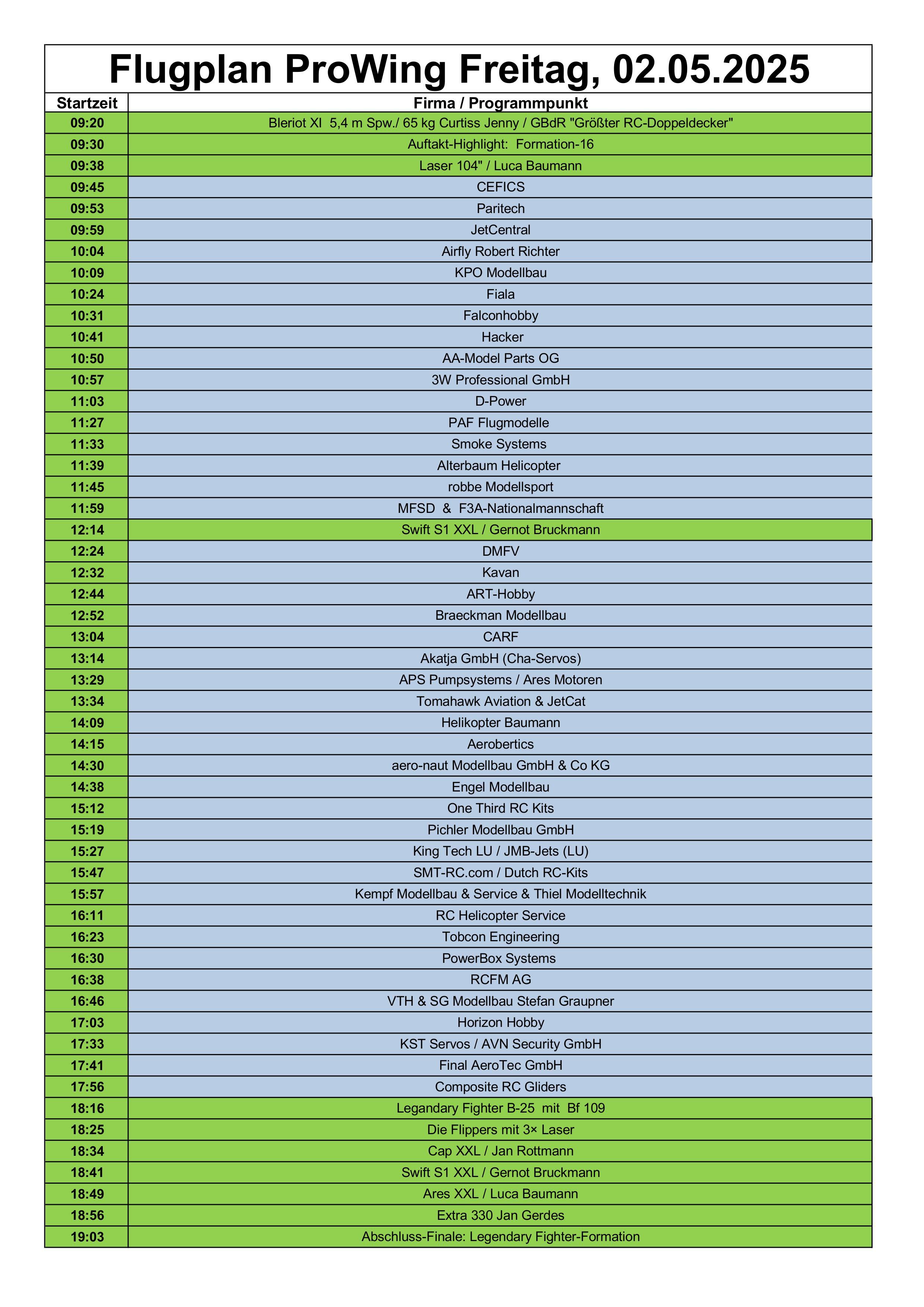Jetzt zählen wir die Tage runter, die ProWing International in Soest/Bad Sassendorf steht kurz bevor. Vom 2. bis 4. Mai 2025 brummt es in der riesigen Halle - und draußen brennt die Luft bei der von der FMT organisierten Nonstop-Mega-Airshow. Überzeugt euch selbst, das vorläufige Flugprogramm für den Freitag, 2.5.2025, steht fest! Hier gibt's den Plan im PDF-Format.